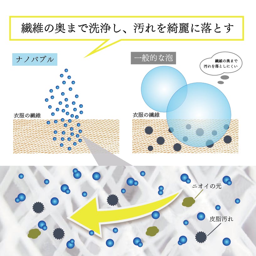 ナノバブルには、「洗剤の洗浄成分(界面活性剤)の効果を高めるチカラ」と、「繊維の奥にしっかり浸透して、汚れを落としやすくするチカラ」があると言われています。