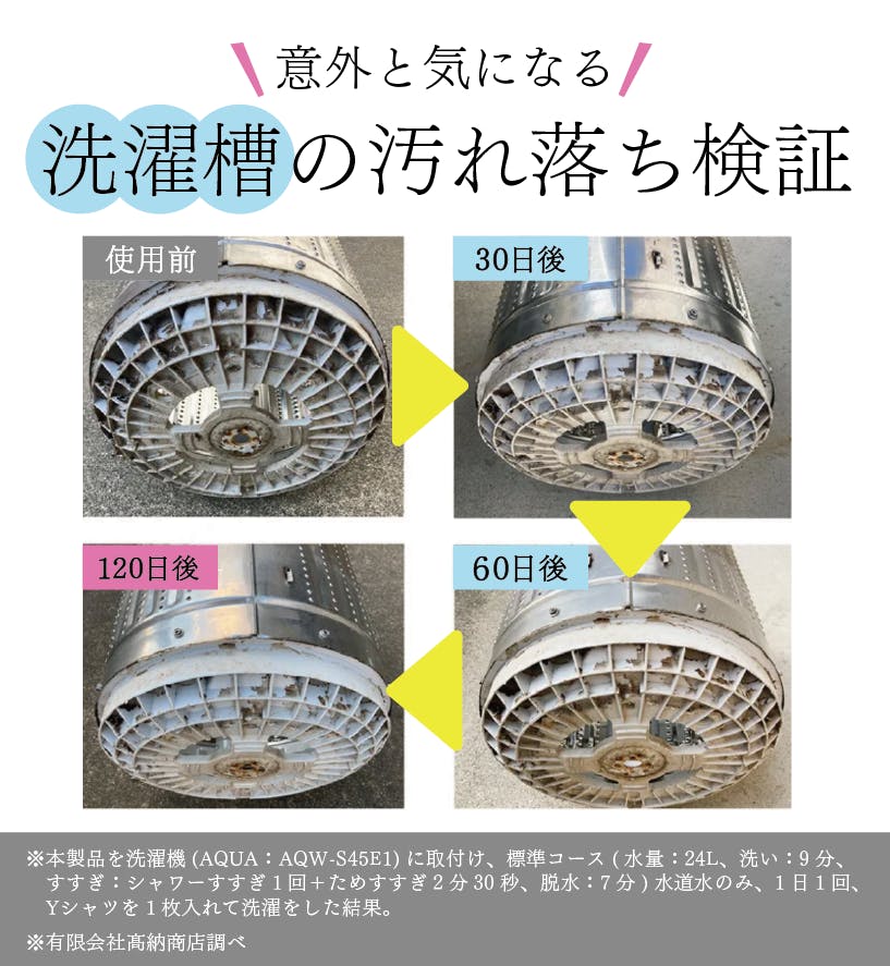 洗濯機の裏側にカビなどの汚れが付着していると、生乾きの原因にもなります。「アワラッシュ」を取り付けて使い続けることで、洗濯槽やパルセーターの汚れにも徐々に効果を発揮します。