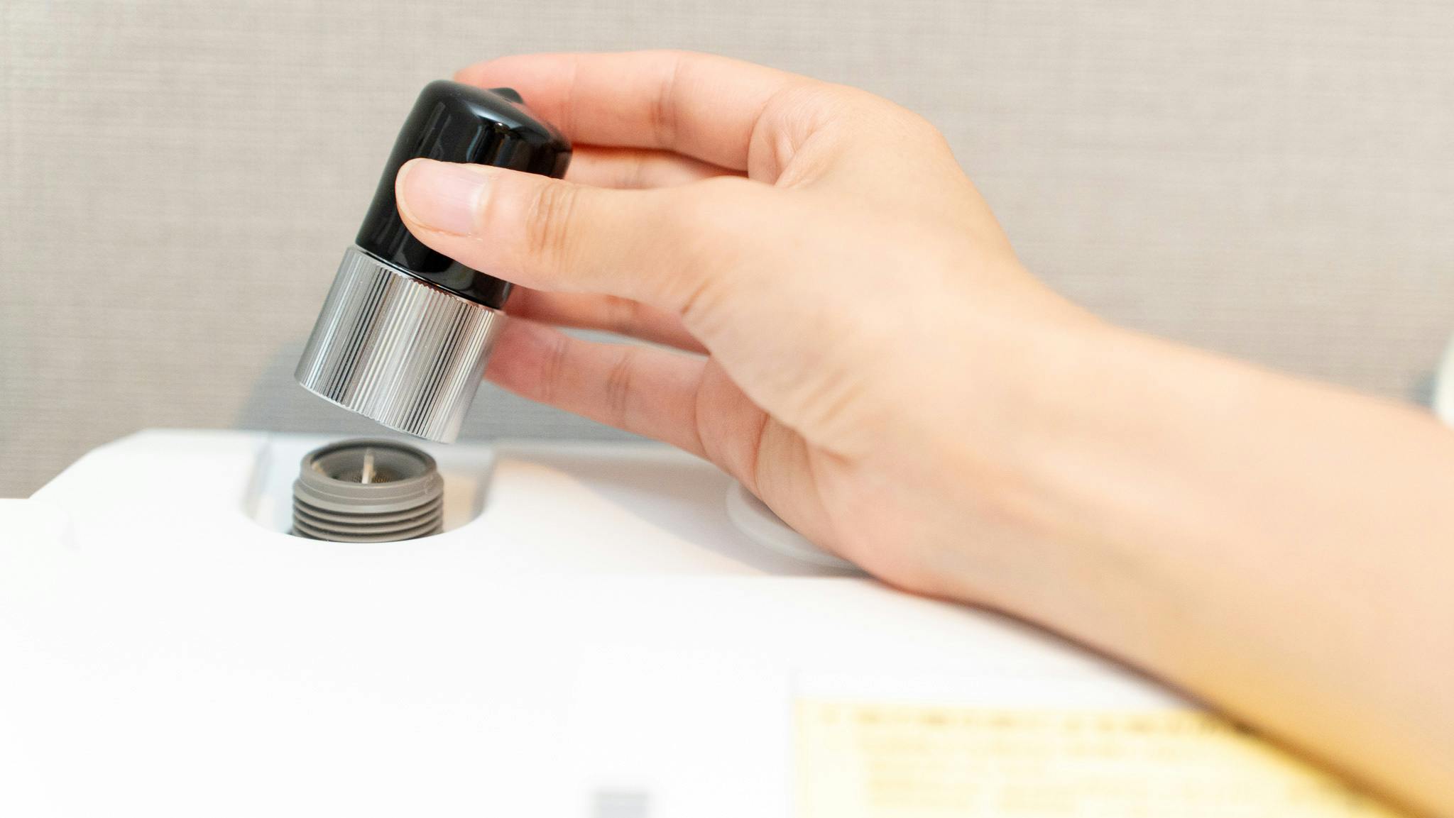 ②保護キャップを装着したまま、「アワラッシュ」を給水口ネジに時計回りに回転させて取り付けます。