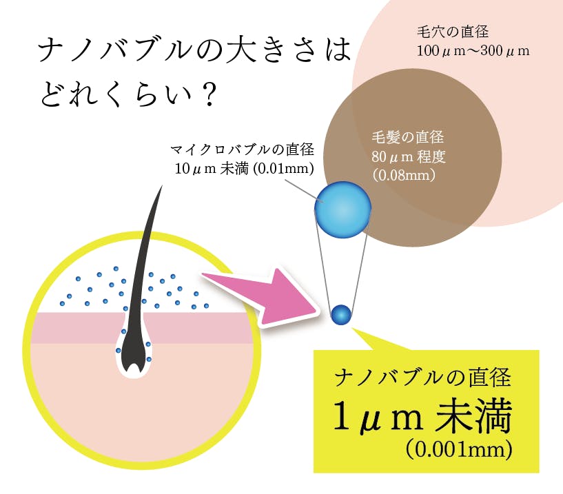 A.ナノバブルはマイクロバブルとは違い、泡はすぐに消失しない性質でございます。ナノバブルは1マイクロメートル未満、マイクロバブルは100マイクロメートル未満です。
