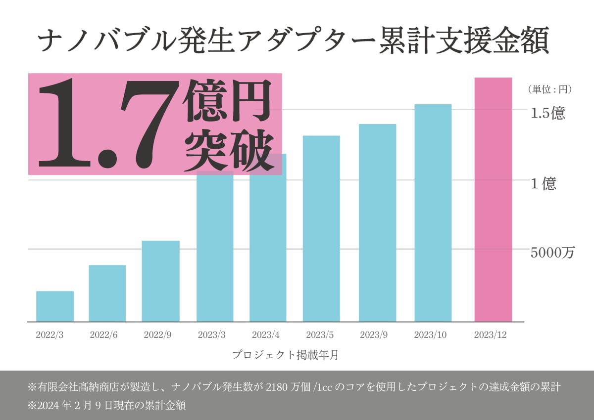 また本製品と同じく、上記のナノバブル発生コアを使用した商品(製造:有限会社髙納商店)は、累計販売額1.7億円を突破しています。