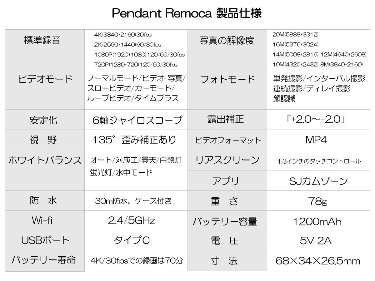 ・オシャレなペンダントのようにビデオカメラを首にかけて 撮りたいときにいつでもすぐに ビデオ撮影をすることができます ・Wifi接続・専用アプリで端末に繋げることができ 撮影した映像をすぐに転送できたり 多彩な撮影モードを楽しめることができます ・腕時計型リモコンで遠隔操作で撮影できます