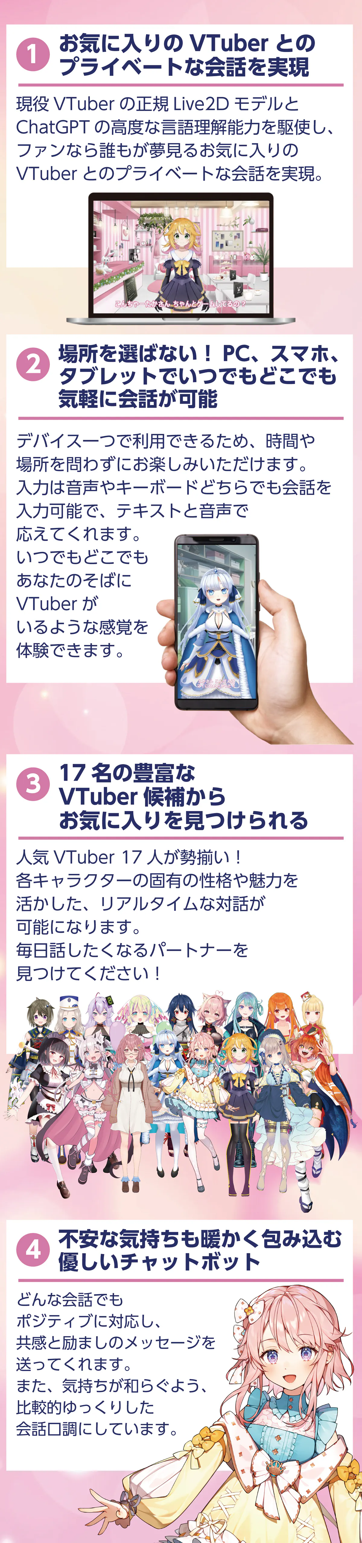 可愛いVTuberとの面白く心温まる会話で、毎日をもっと満足できるものにしていただきたいです。