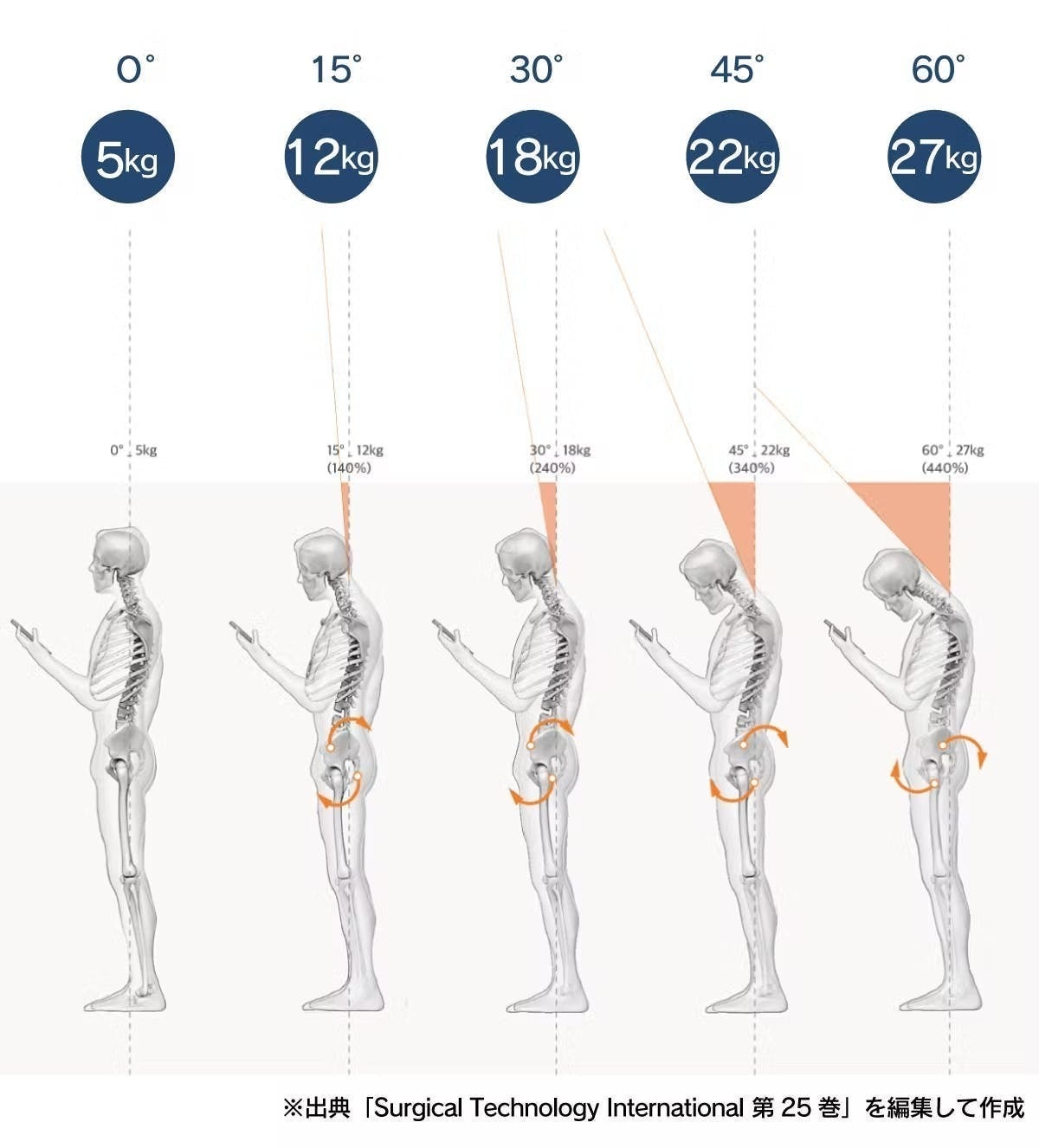 スマホユーザーが毎日行っている首の傾きは、たった15℃でも首の後ろの筋肉や、肩甲骨周辺の筋肉に 12kgもの負荷をかけます。