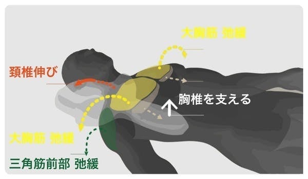 夜眠るたびに、猫背、巻き肩姿勢で収縮した胸、肩の筋肉を伸ばしやすくし、背骨から頭を支える理想の姿勢へ導きます。