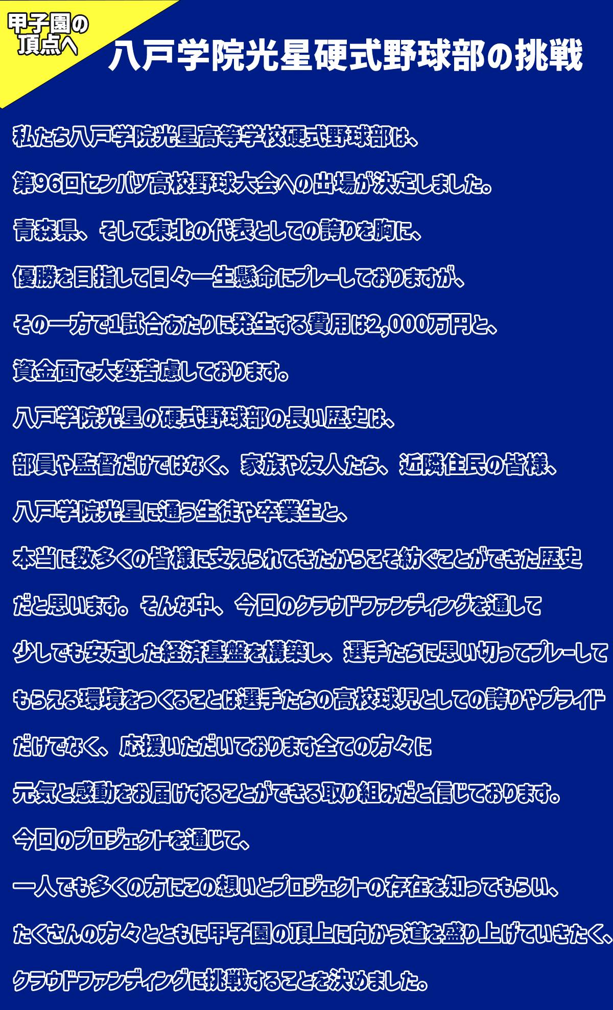 甲子園出場は、学校にとって大変名誉なことではございますが、その一方で大会期間中の交通費・宿泊費、応援生徒たちの甲子園入場チケット費・交通費・宿泊費をはじめ、非常に多額の費用を要します。滞在期間が長期間になればなるほど、莫大な費用が必要となりますし、それに加え、甲子園に出場する選手や応援する生徒の安全を守るため、コロナ対策にも十分に取り組む必要があります。それら全てを学校関係者だけでまかなうには限界があります。多くの皆様に選手たちの甲子園での活躍へのご支援を賜りたく、今回のクラウドファンディングを立ち上げました。