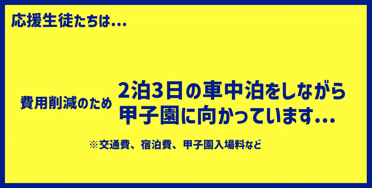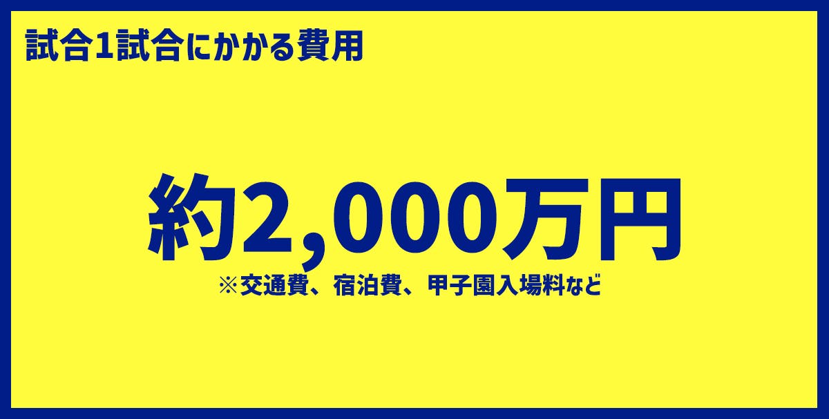 本州最北端の青森県から甲子園に出場するのには、1試合で約2,000万円ほどの費用が発生しています。仮に決勝まで勝ち進んだ場合を仮定すると、約1億円まで費用が膨らみます。甲子園でプレーする選手はもちろん、応援隊にも費用は発生します。200名以上いる応援隊1名あたりのコストだけでも1試合あたり約50,000円、これでも費用削減のために2泊3日の車中泊をしながら青森から甲子園までの道のりをバスで行き来している状態です。このように、白球を追いかける球児たちの憧れの晴れ舞台の裏には、限られた予算の中での試行錯誤が存在しています。