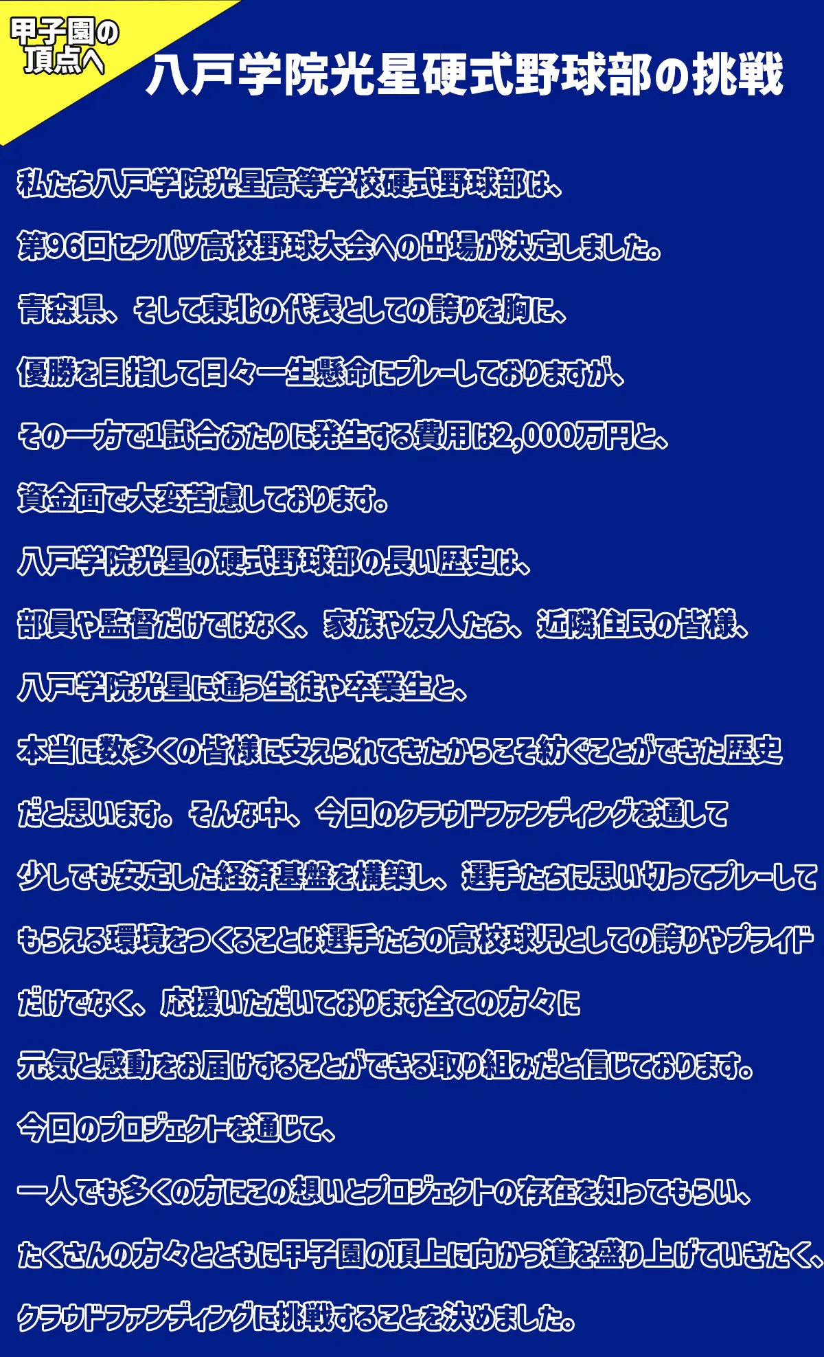 このように私たちは、厳しい資金調達の問題に直面しております。更に春夏連続での出場となりますので、例年以上に資金面での厳しい現実と向き合う必要がございます。少しのお気持ちでも、球児たちの夢をサポートする大きな支えになります。今、この瞬間にも、甲子園で勝利の喜びを分かち合うために、毎日厳しい練習に励んでいる高校球児たちがいます。そんな選手たちの甲子園での躍動を健全にサポートするべく、しっかりとした支援体制を構築していくためにクラウドファンディングに挑戦させていただきました。