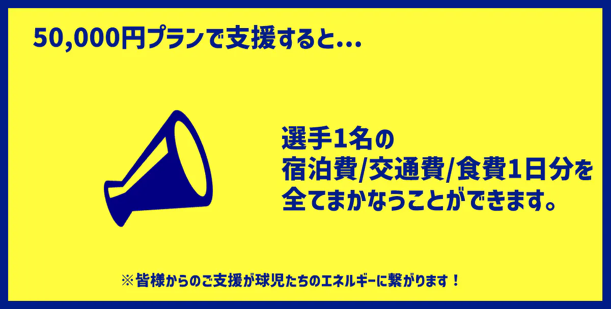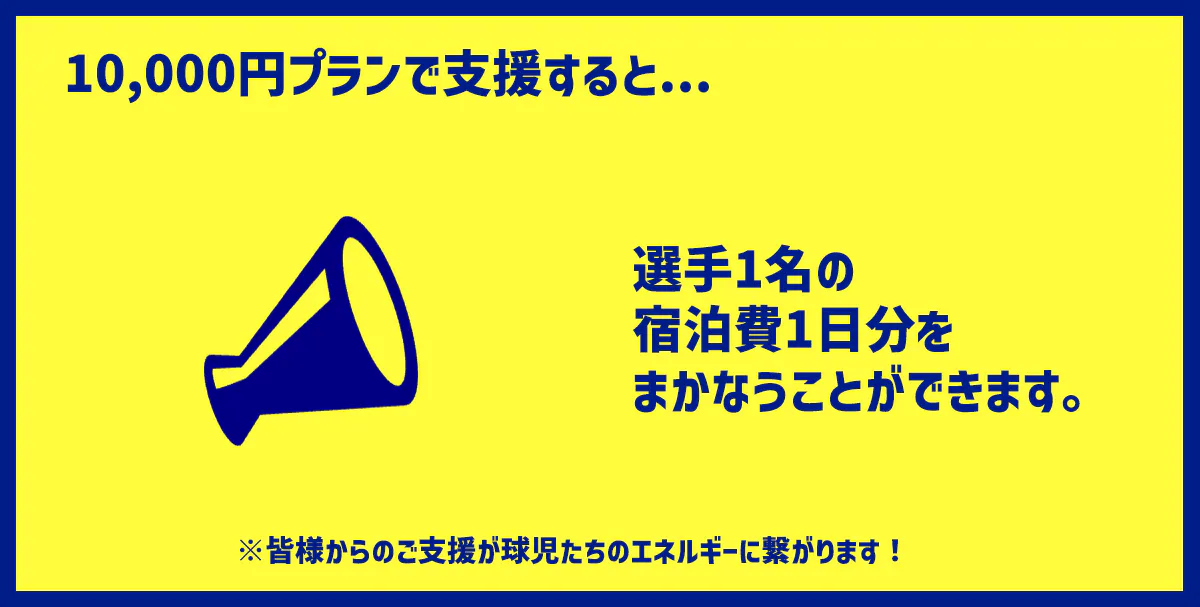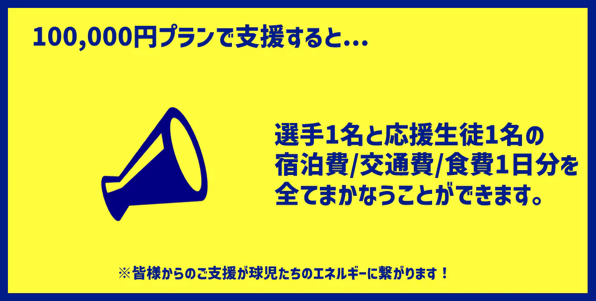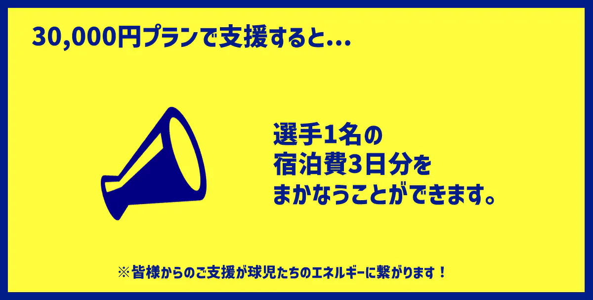 ※こちらのご支援で、選手1名と応援隊1名の宿泊費・交通費・食費(1試合分)をまかなうことができます。