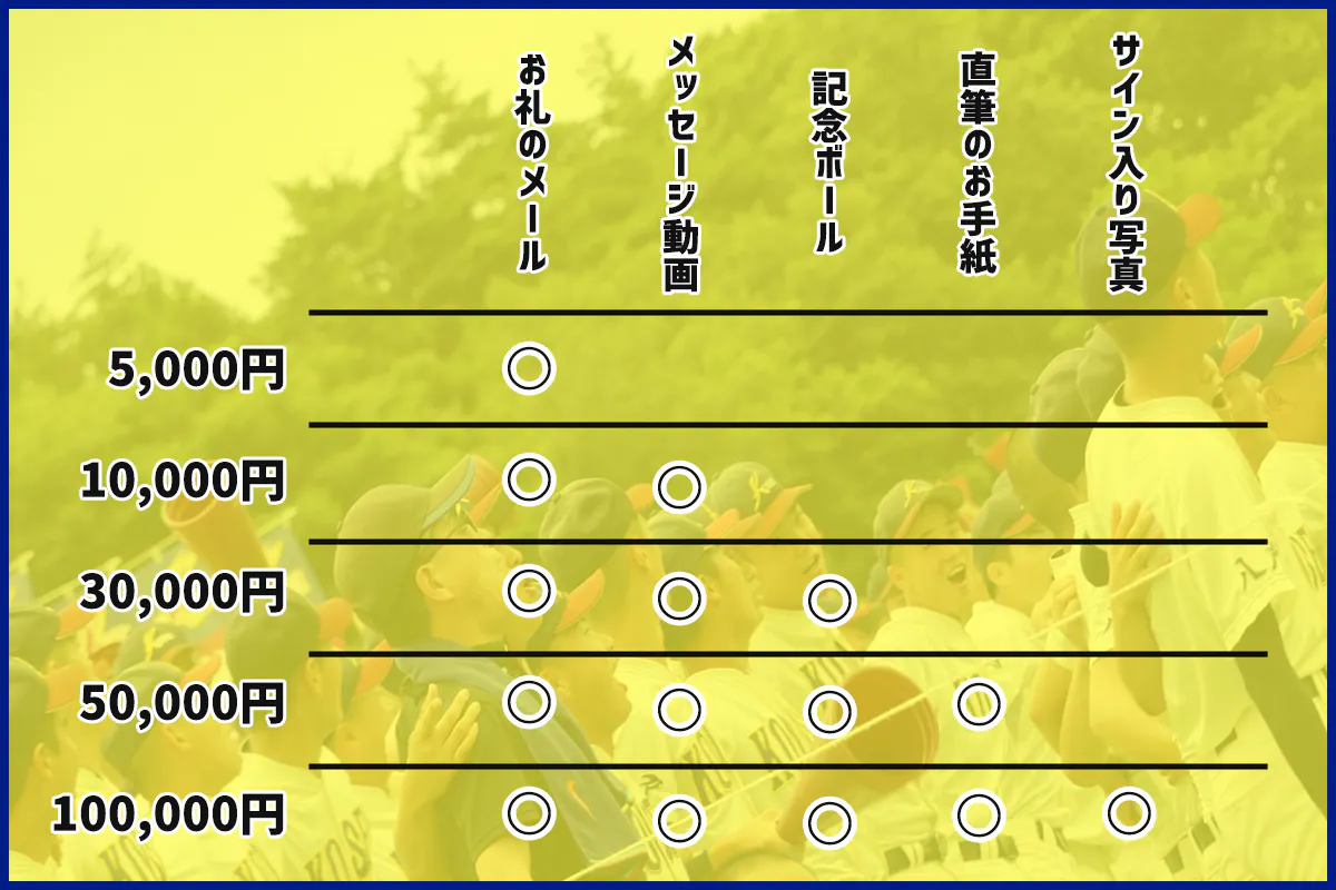 選手からのメッセージ付きのお礼メール、お礼のメッセージ動画、記念ボール、直筆のお手紙、サイン付き写真を送付させていただきます。