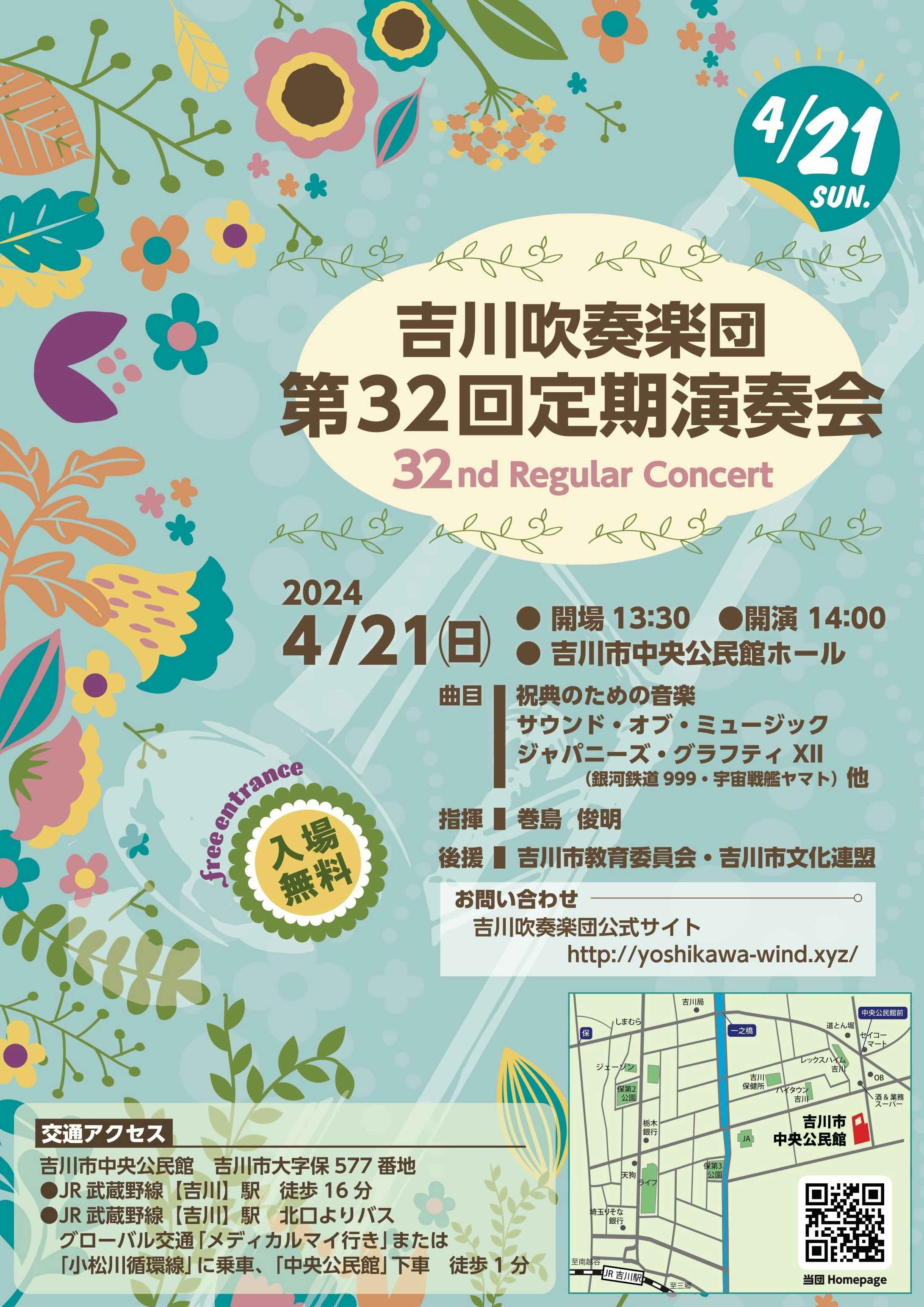 吉川吹奏楽団は埼玉県吉川市で活動する、音楽を中心にして地域の文化向上を目指す社会人を中心とした吹奏楽団です。『音楽大好き!』を第一に、そしてたくさんの人に愛されるバンドを目標に活動されています。吉川吹奏楽団は昭和63年12月に吉川中央公民館で行われた「公民館ひとときコンサート」に東京の足立吹奏楽団が出演した際、この演奏会を招聘した前団長の柳井氏・河西氏との出合いがきっかけとなり、吉川町にもぜひ吹奏楽団を作ろうと話が進み誕生しました。平成3年から始まった定期演奏会も、2024年には32回目を迎え、着々と歴史を刻まれる中、最近は中・高・大学生メンバーもじわじわと増えているのですよとの事で、現在、地域のたくさんの人からあたたかく見守られながら、社会では色々な立場にいる仲間が『音楽』を通して和気あいあいと活動されています。
