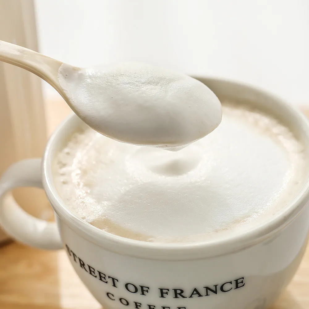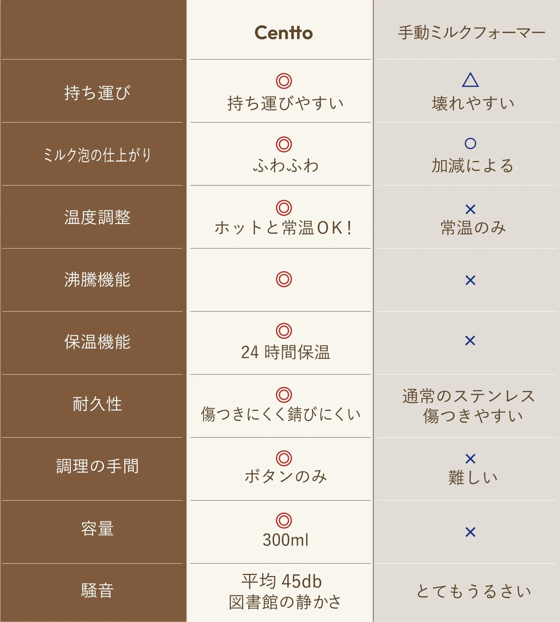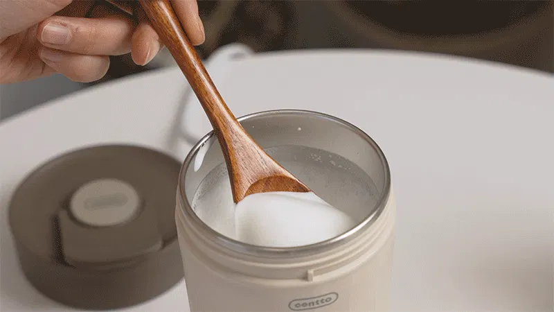 一般的にカフェのミルク泡は「スチームミルク」と言い、エスプレッソマシンで蒸気を発生させ空気を含ませる作り方です。そのため、水分を含んだ液状の薄いものになります。Centtoで作る「フォームミルク」は高速回転で空気を含ませる製法なので、牛乳100%のきめ細やかでふわふわな食感のミルク泡が出来上がります。Centtoはカフェを超える完成度の濃厚ミルクフォームが可能です。