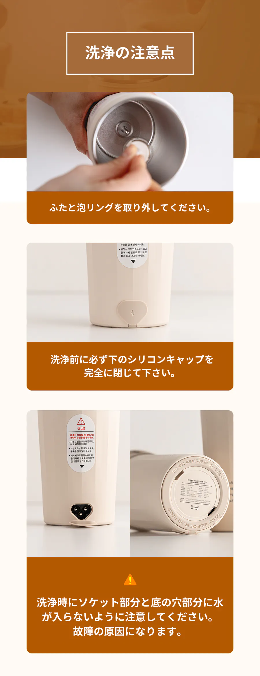 説明書の洗浄時の注意事項を必ずご確認ください。ミルクスチーム及び泡の使用後、すぐに綺麗な水で洗浄して頂き蓋を開けて自然乾燥して保管して下さい。本機器は家電製品のため、食器洗い機は使用できません。