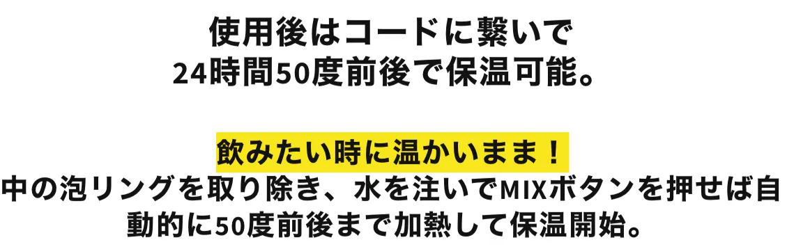 コード未接続の場合だと24時間50度前後の保温モードは機能しません。電源のある場所でご使用ください。