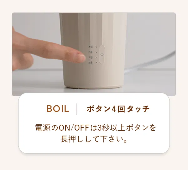 ・BOIL:約8分 バブルリング未装着の状態で97度前後まで液体を加熱させます。
