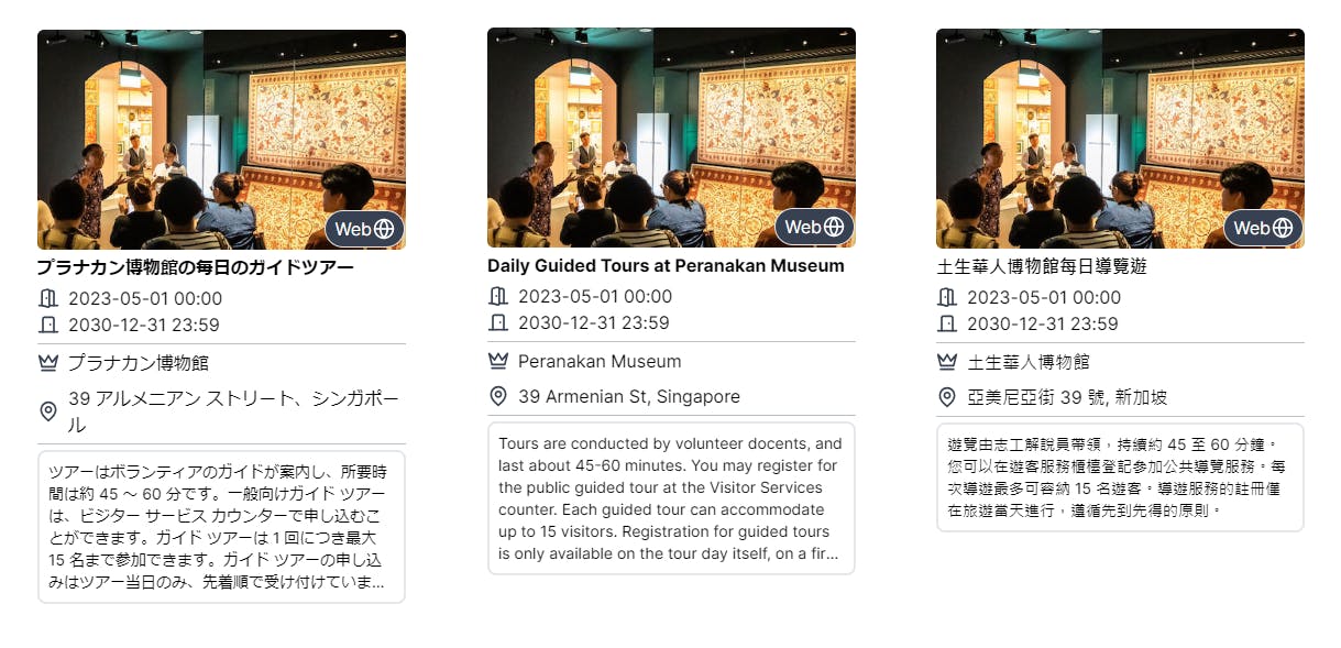 異なる言語にアクセス出来るこのサービスは、訪問者がその地域の文化やイベントを詳細に理解することを可能にします。また、イベントの日時や場所、アクセス方法が視覚的に表示されるため、検索の際、非常に便利です。