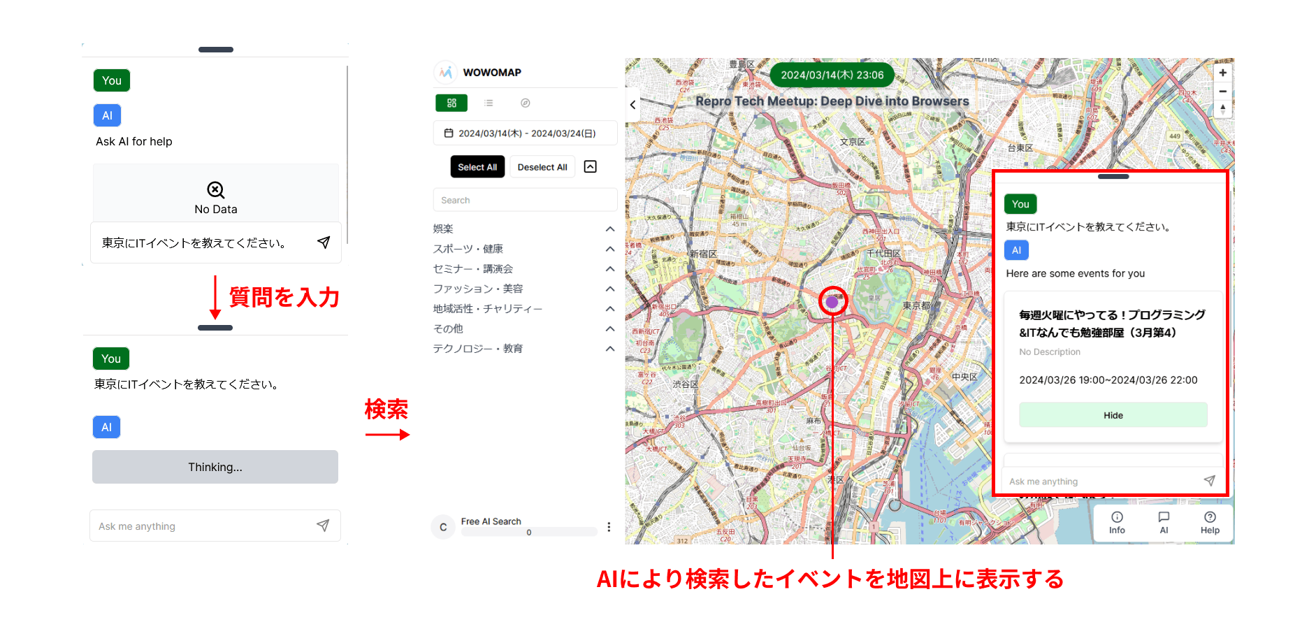 従来の検索サービスでは正確なキーワードを入力しなければ関連する情報を見逃すリスクが高く、新規追加されたものやマイナーなスポットが埋もれがちでした。『WOWOMAP』のLLMを用いることで、日常的な言葉を使った質問でも、直感的な検索が可能になり、ユーザーは具体的なキーワードを事前に知らなくとも、興味やニーズに応じた情報を簡単に見つけることができます。