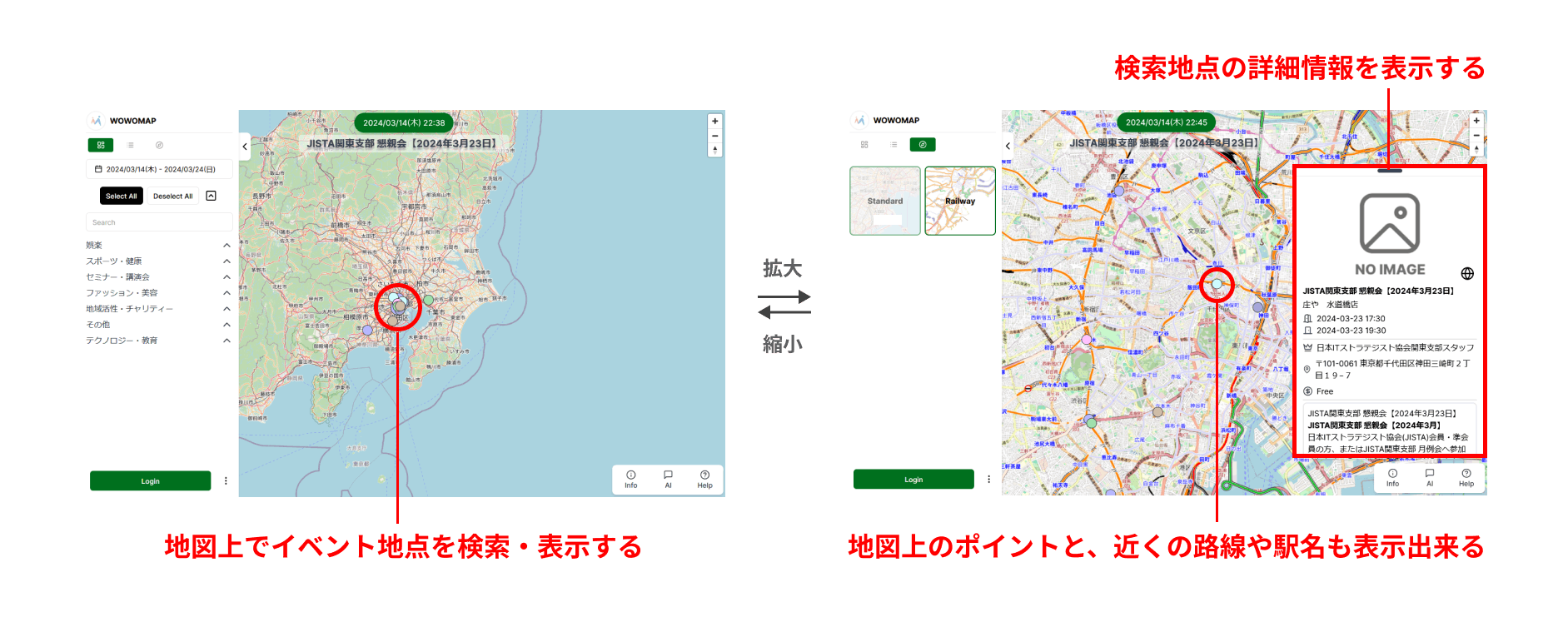 直観的なイベント地点の検索が出来るよう、視覚的な検索が可能です。特に地理的な位置関係を把握する場面で有効となります。ユーザーは地図を見るだけで興味のあるイベントがどこで開催されるのか、どのようにアクセスすれば良いのかを一目で理解できます。