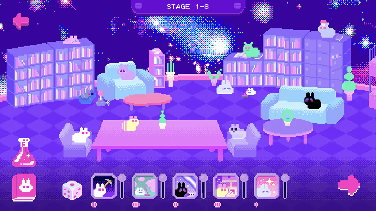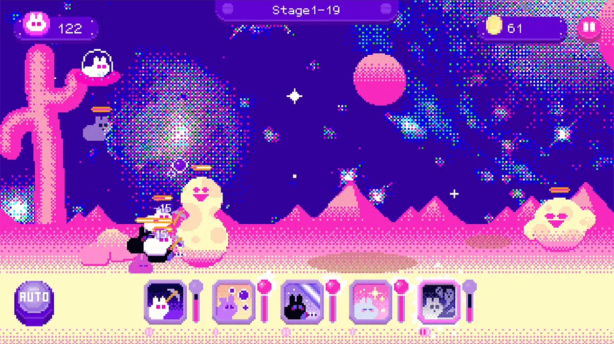 『チーズムーン』は、モバイルと、Steam等のPCプラットフォームで同時発売予定のオートバトルゲームです。最大5匹のウサギを登録して、ウサギのクローンを召喚し、スキルを使用して戦います。一定数以内のクローンを召喚してステージをクリアすることが目的です。