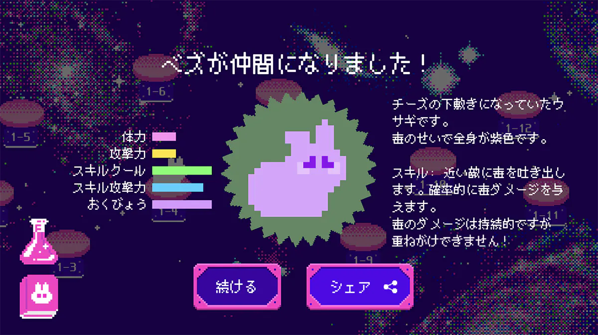 ウサギはそれぞれスキルと能力値が異なります。ウサギをうまく組み合わせて、敵を乗り越えていきましょう。