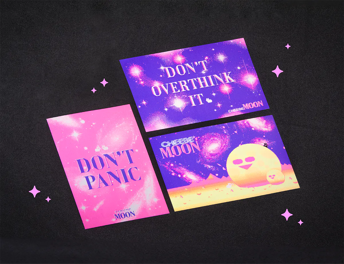 蛍光インクでプリントして素敵な色味を持ったはがき3点セットです。『チーズムーン』の美しい宇宙をはがきでどうぞ。