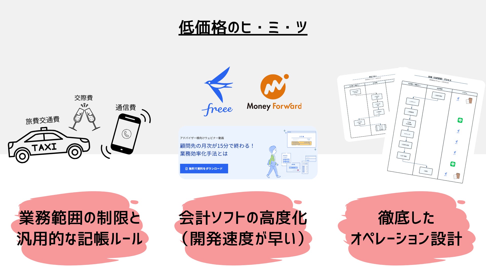 業務範囲を限定することで、価格は相場の1/4まで抑えながら、経営者が一番苦労している”記帳”の負担を減らします。