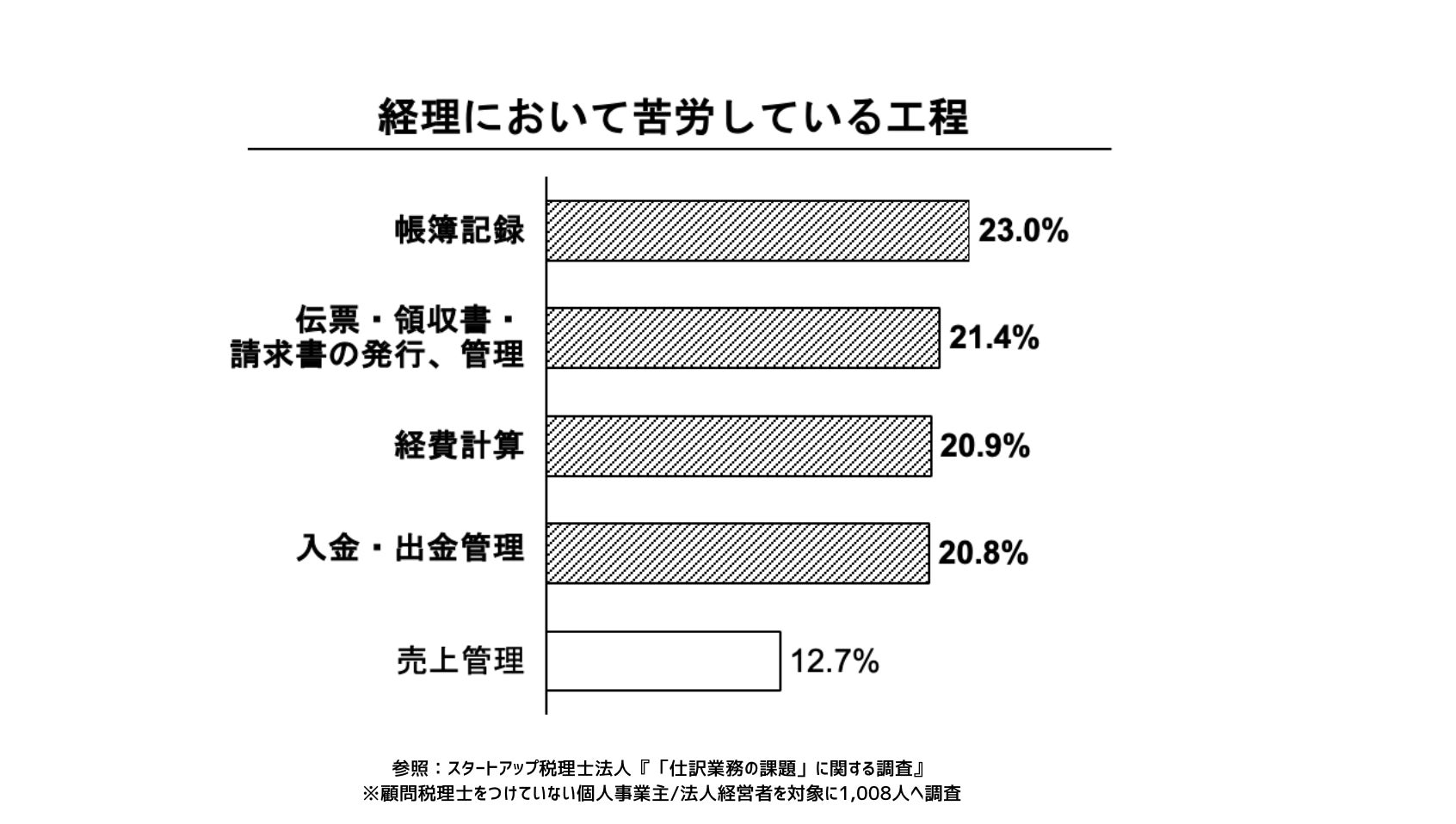 経理と言っても幅広く、決算や申告・納税から、日々の売上管理や経費精算や帳簿への記帳までありますが、経営者が一番苦労しているのが帳簿記録(記帳)です。