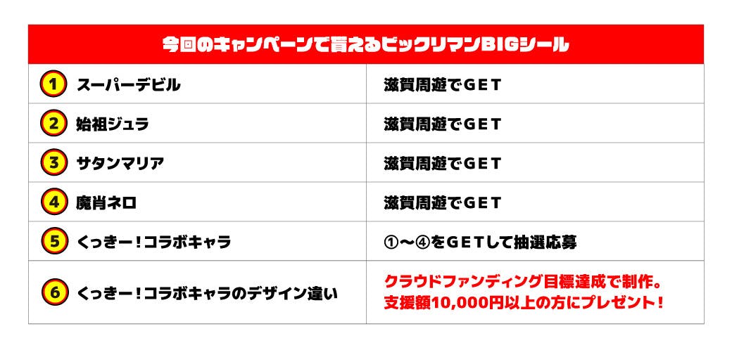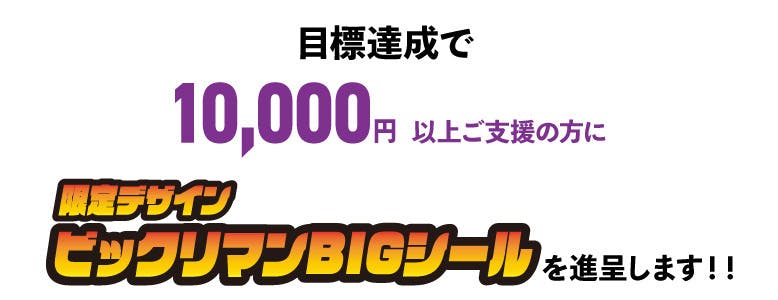 このクラウドファンディングでは、今回のキャンペーンをさらに盛り上げる為、クラウドファンディングに10,000円以上ご支援いただいた方に特別デザインビックリマンビックシールを制作する予定です。