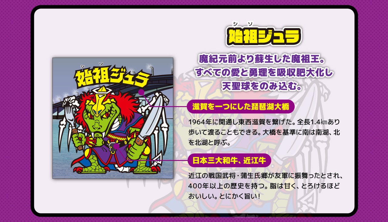 滋賀県内19の道の駅を4つのブロックに分け、各ブロックごとに今回限定の滋賀県らしさをデザインした「ビックリマンBIGシール」をプレゼントします。この機会に滋賀県全域を周遊いただき、その魅力を存分に味わってください。