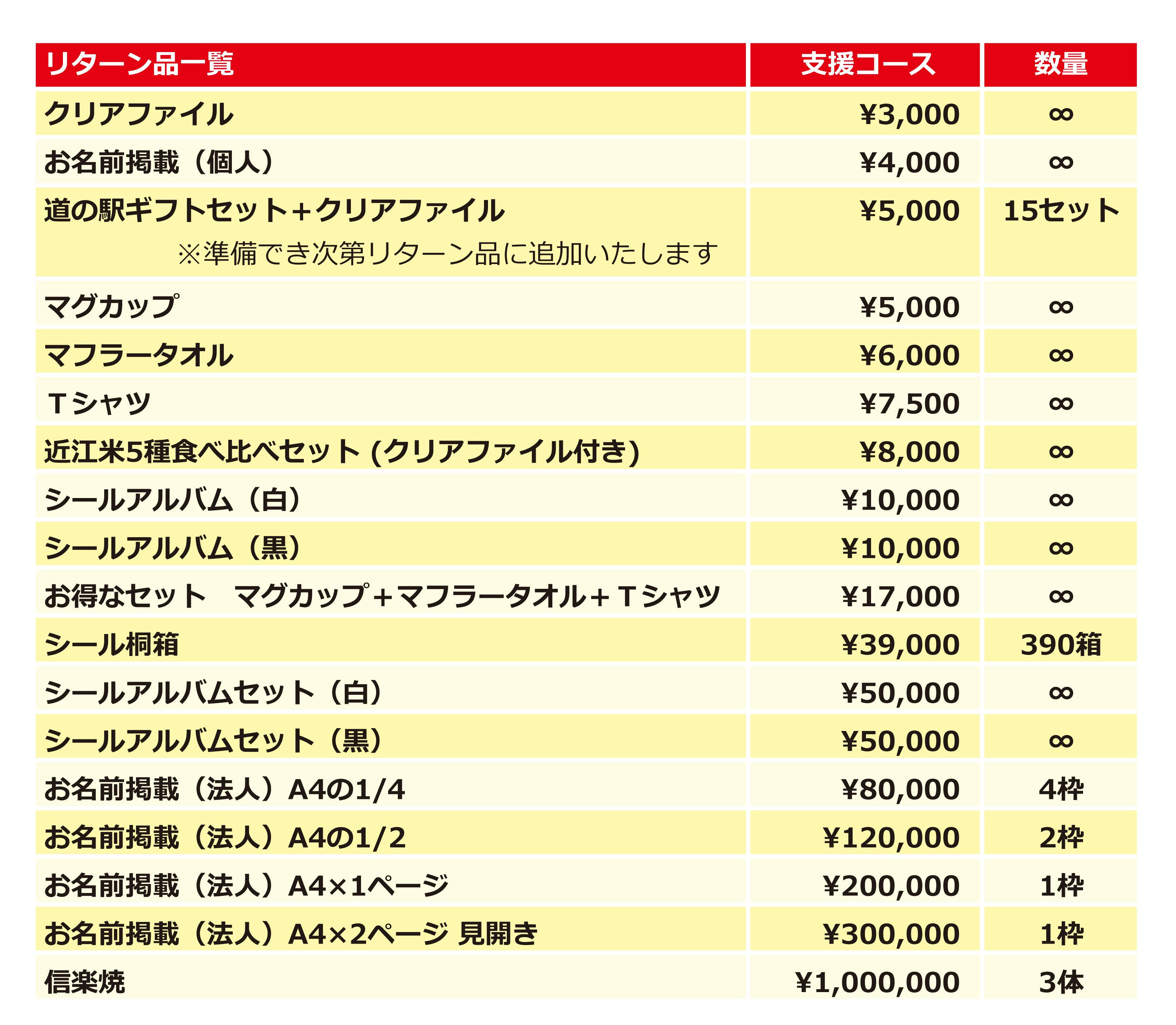 2024/10/23 20:00皆様のご支援のおかげをもちまして、一部の品を除く、リターン品発送の第1段階を終えさせていただきました。(最終発送日→2024年10月3日)発送時点のお問合せ番号の連絡は行っておりませんので、ご不明な方はメッセージでお問合せくださいませ。下記のリターン品をお選びいただいたご支援者様におかれましては、発送までもうしばらくお待ちいただけますようお願いいたします。---------------------------------------------------------▼準備中のリターン品【近江米5種食べ比べセット・クリアファイル付き】2024年11月発送予定【信楽焼で創る、ブラックゼウス】2025年6月発送予定---------------------------------------------------------・・1万円以上のご支援者様には、リターン品と同梱にてビックリマンBIGシールをお届けしております。\くっきー!さんによる特別な背景デザイン/・・発送にあたり、至らない点もございましたが、皆様には寛大なご対応を賜り深く感謝申し上げます。どちらの品も心を込めて制作しましたので、ぜひご愛用をお願いいたします。滋賀県道の駅連絡会 もっと見る