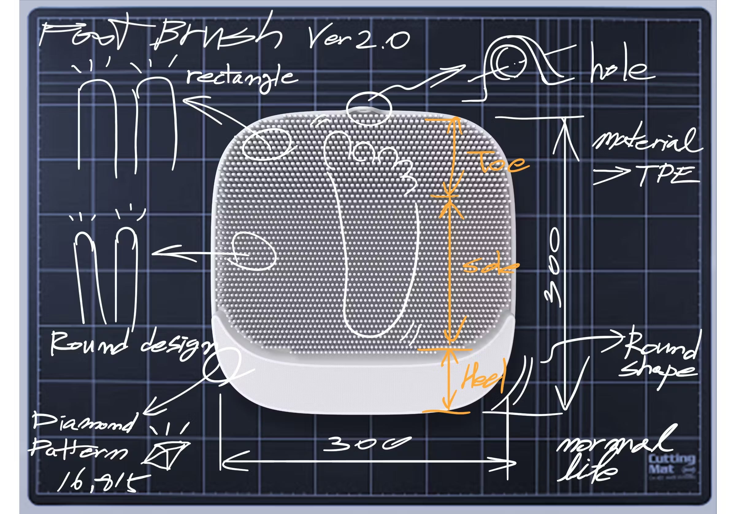 今回のプロジェクトでは、フットブラシが新たにVer.2にアップグレードされました。新しいかかとヤスリは、溜まっていたかかとの汚れがもっとキレイに流してくれます。