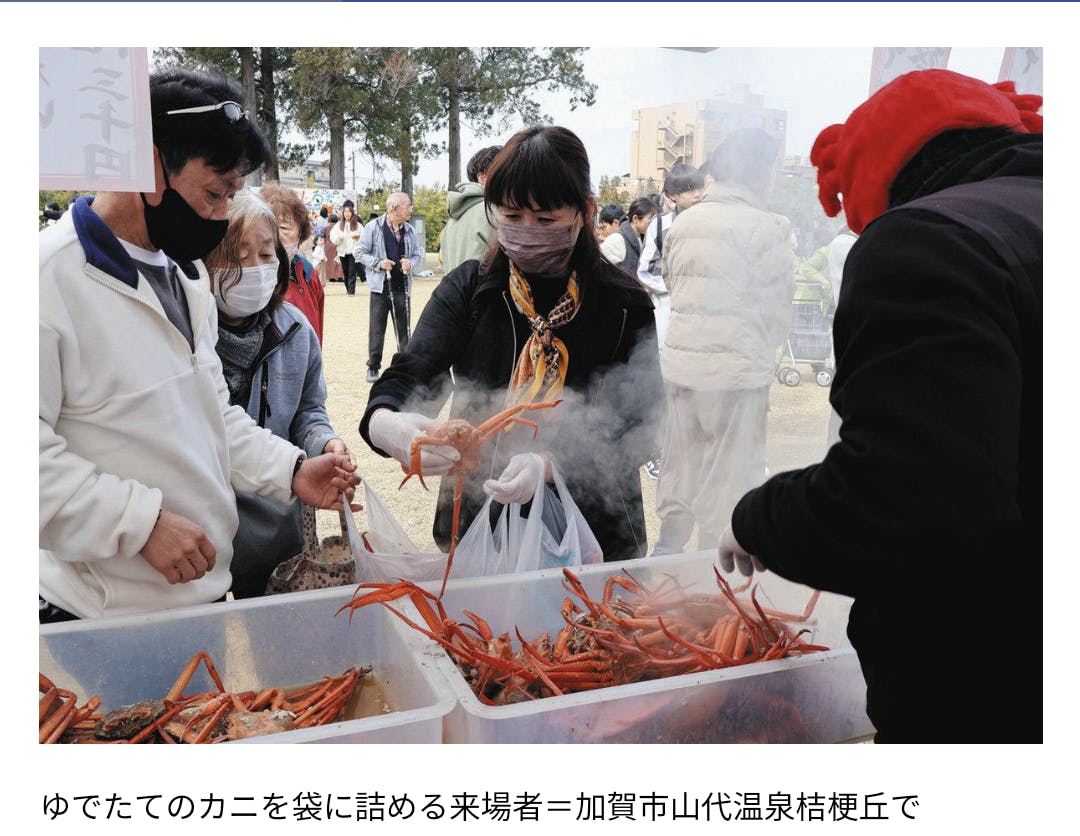 2024/03/25 14:42山代 ゆでたて袋いっぱいに山代温泉観光協会が主催し、温泉の魅力である食と九谷焼がテーマ。七尾市の道の駅「能登食祭市場」から3店舗が出店し、会場を盛り上げた。今季の「食べ納め」とされたカニ鍋は500食が用意され、九谷焼の器で提供。ゆでたてのカニを袋に詰めるブースもあった。絵付け体験では子どもたちが新幹線をイメージした流線形の平皿を茶や水色で飾り、楽しんだ。 能登半島地震を受けて休業している能登食祭市場から参加した直売所「鹿渡島定置」がズワイガニの詰め放題を販売し、販売ブースでは数馬酒造(能登町)の日本酒や谷川醸造(輪島市)のしょうゆなどが人気だった。福井市から訪れ、日本酒を購入した主婦の富田紀子さんはは「能登にまだ行けないが、寄付とは別に買って貢献したい」と話した。※記事より抜粋 もっと見る