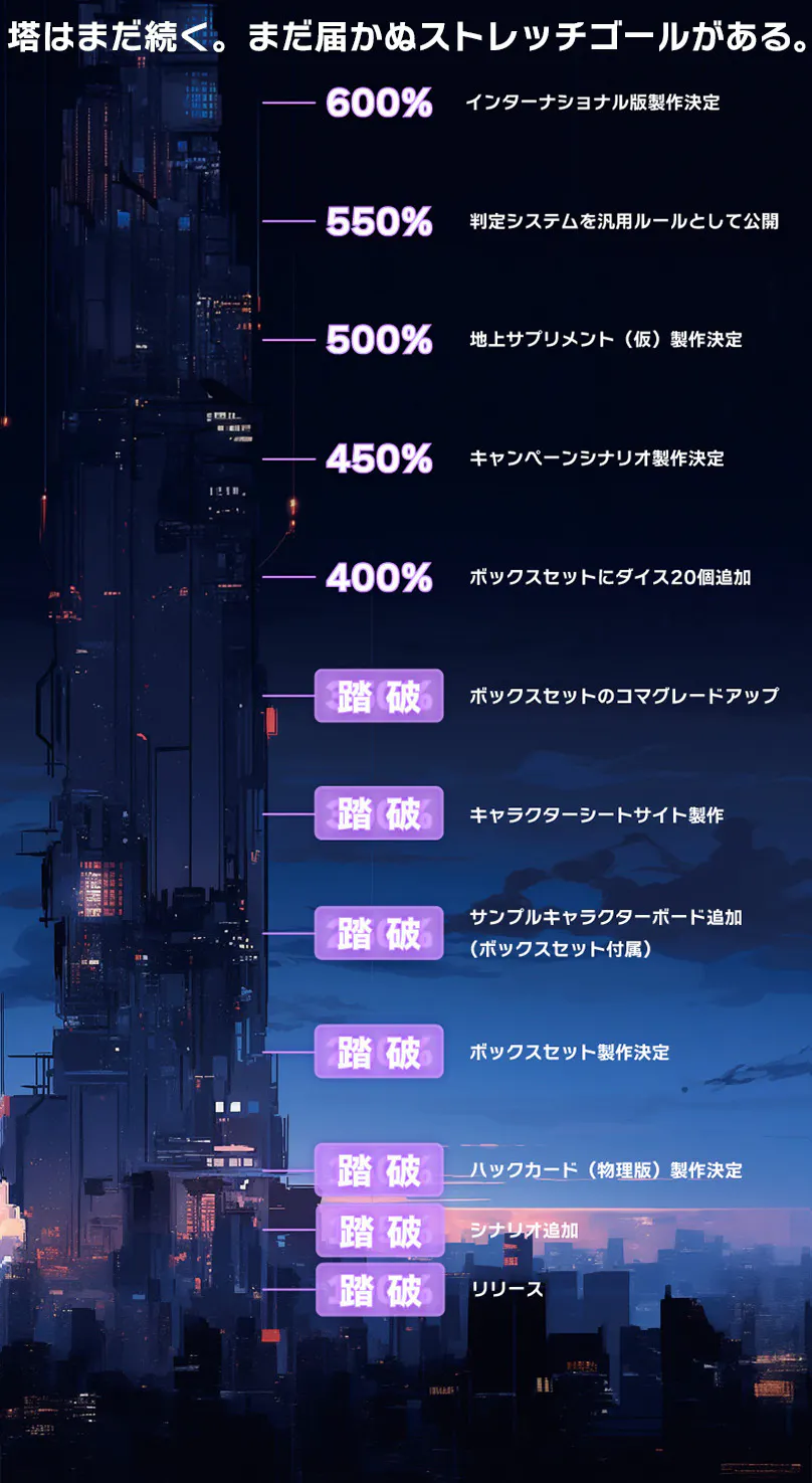 電子版+物理書籍版ルールブックをお送りします。150%のストレッチゴールを達成した場合、印刷版のハックカードが追加されます。