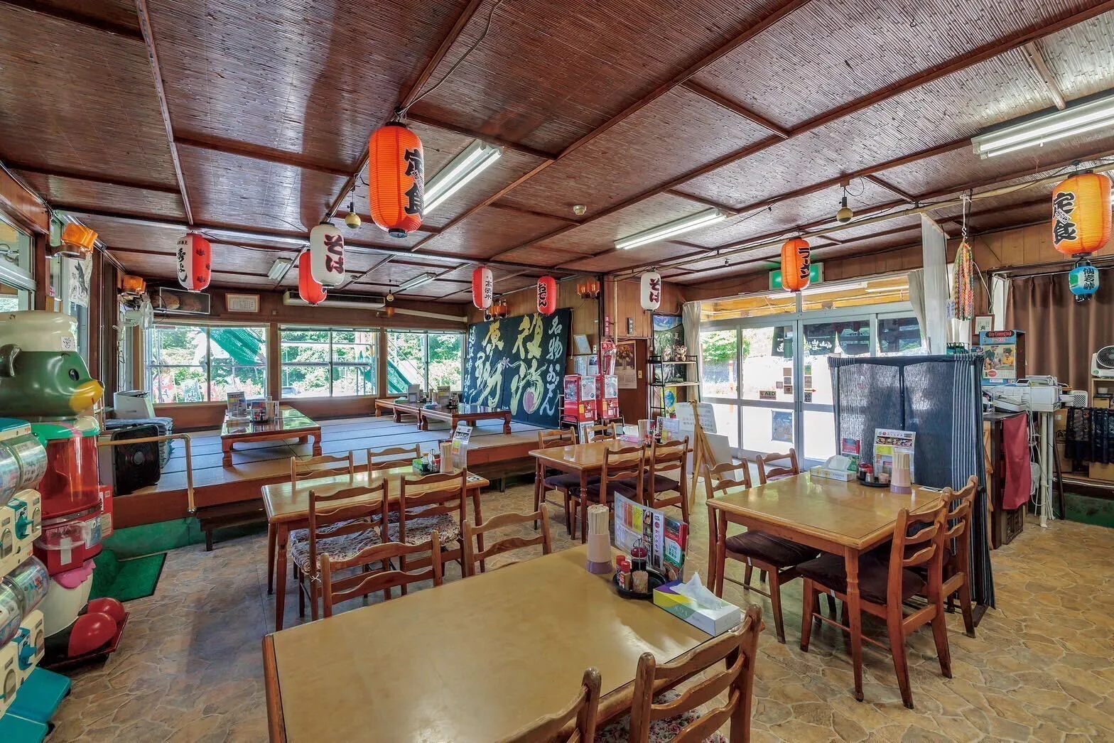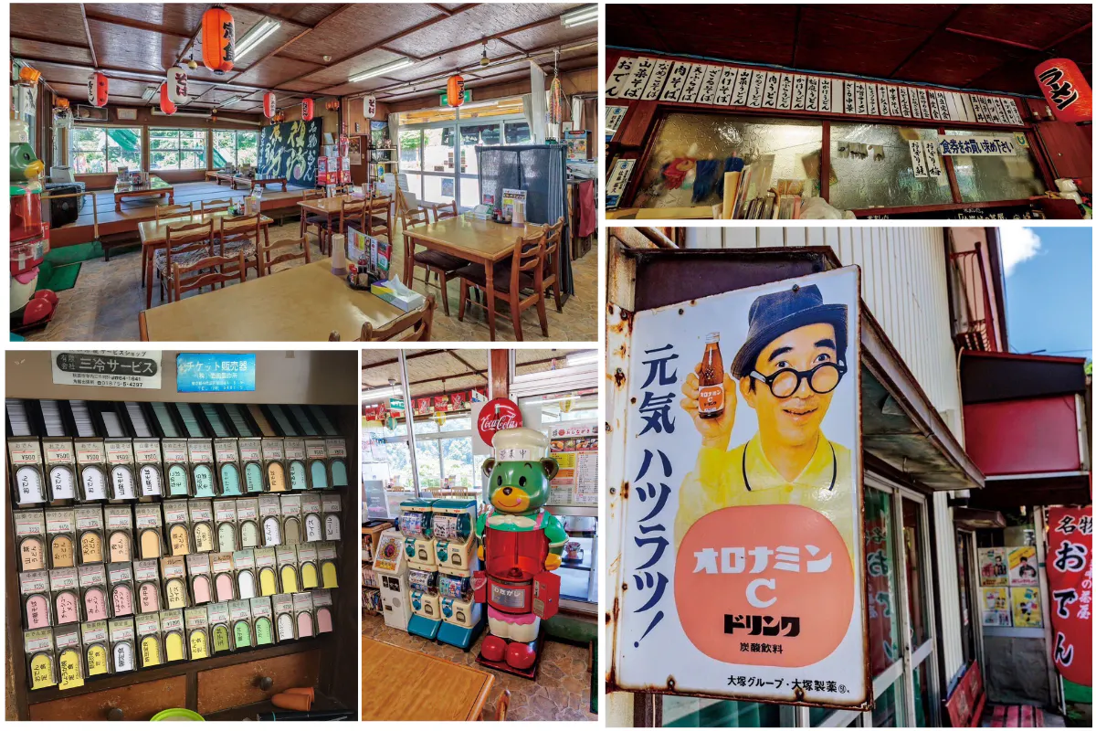 店内は昭和のドライブインの雰囲気そのもの。現役のくま型の綿あめ機、昭和のポスターなど今では、あまり見られない機械や飾りものに懐かしさを感じることができます。ついつい写真を撮りたくなるような魅力たくさんの店内です。