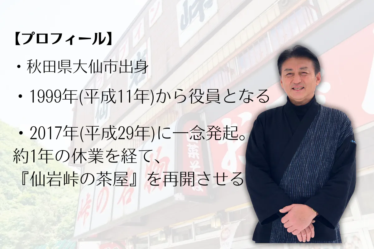 仙岩峠の茶屋と私は丙午生まれの57歳です。創業から親子2代に渡り、多くの努力と情熱を注がれて来たお店です。3代目として私が引き継ぐ前からの30年は貴重な経験と学びの時間でした。私にとって言葉に言い表せない大切なお店です。これからも伝統と価値を大事にしながら、10年20年先の未来に向けて更なる発展を目指して参ります。この度のプロジェクトをご支援いただいた方、今後私とお会いする機会がありましたら、是非ともお声がけください。お礼を直接伝えたいと思っています。ご支援、よろしくお願い致します。