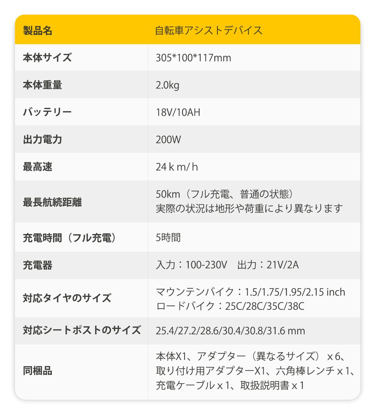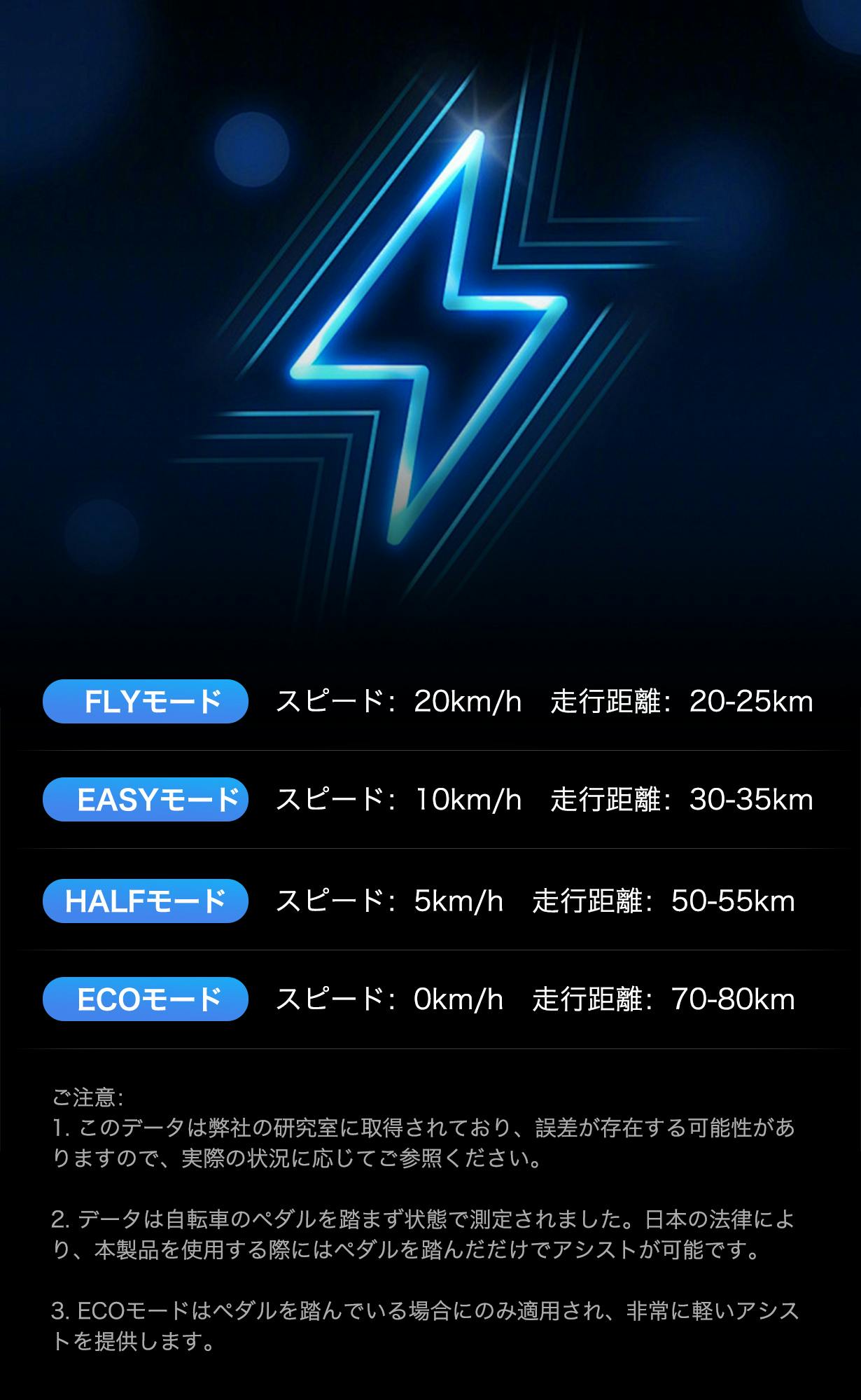 ご注意:日本の法律により、電動アシストデバイスの最大時速が24km、それ以上はアシストパワーを増加しません。