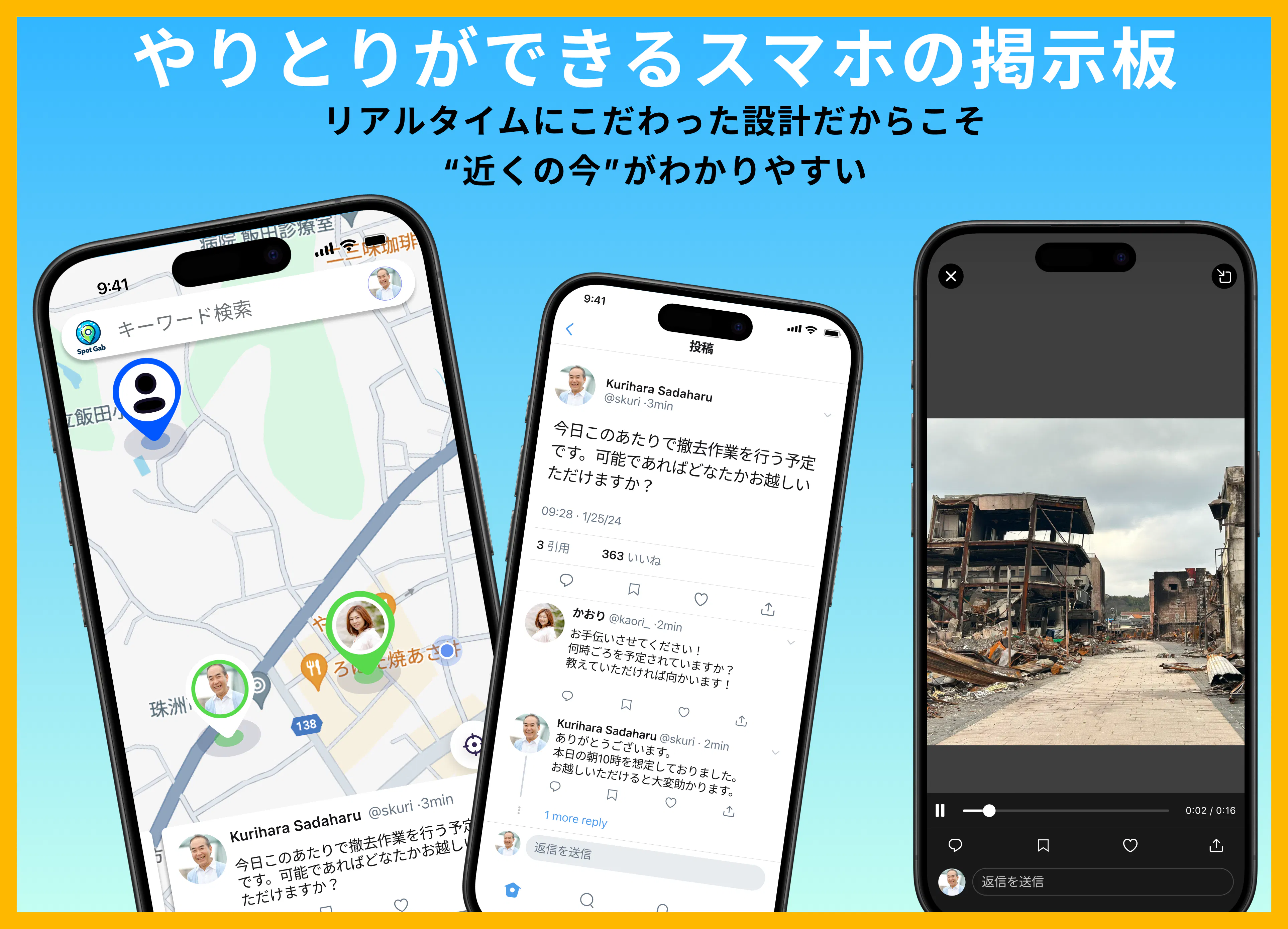 地域コミュニケーションをリアルタイムで強化し、マップ上でのやり取りを通じて、新しい形の協力と繋がりを生み出すものです。