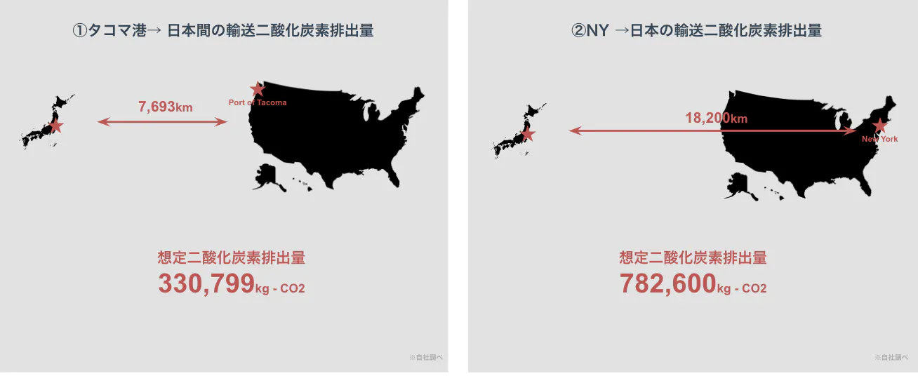 最後に、環境配慮の面でのお話をもうひとつ。世界各地から、クラフトビールを船、または飛行機で運んでくるとき、当然二酸化炭素が排出されます。その排出量は、当然距離が遠ければ遠いほど多くなっていきます。ワシントン州に位置するタコマ貿易港は、日本とアメリカをつなぐ、最も距離の近い貿易港です。弊社調べでは、例えば東海岸に位置するニューヨークから日本への輸送にかかるCO2の排出量と、ワシントン州から日本への輸送にかかるCO2の排出量は、半分以下で済む試算となっています。