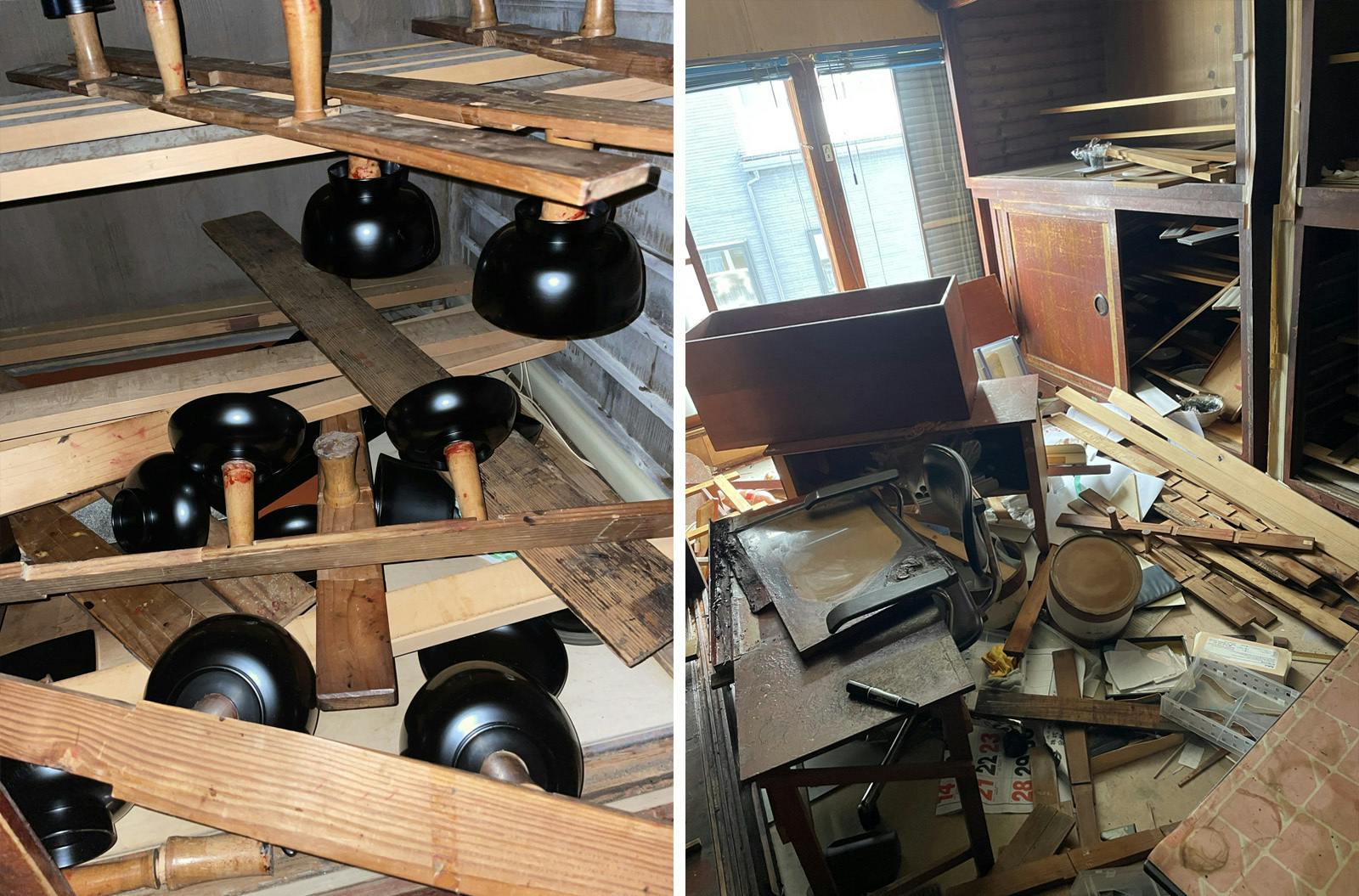 ショールームに展示していた漆器も多くが破損し、そのままでは商品とならなくなりました。貴重な日本産漆を保管していた倉庫が全壊し、また製作に長い時間がかかる輪島塗ですが、その製作途中の品を保管していた建物も全壊し、諦めざるを得ない状態です。
