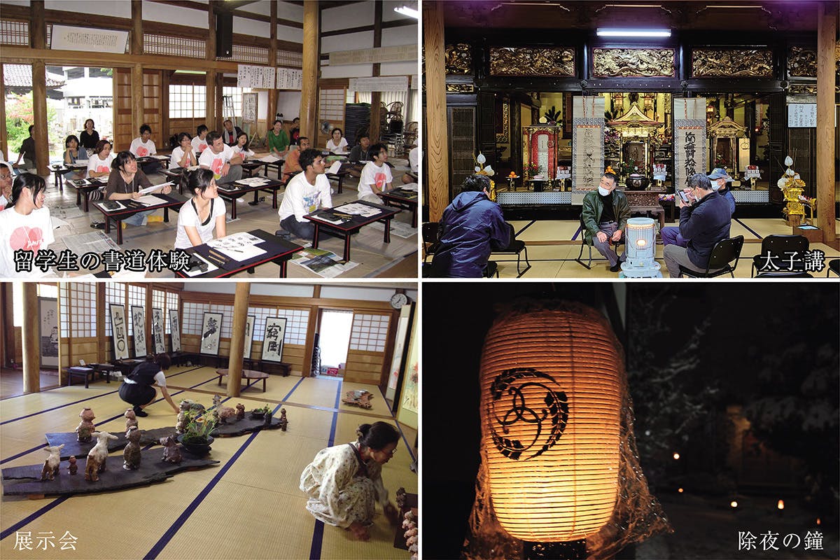 当寺は文化に通じており普段から様々な団体と交流を深めています。留学生の書道体験教室、美術作家の展示会場、海外アーティストを招いてライブ活動など様々な文化交流の場として当寺本堂は活用されていました。