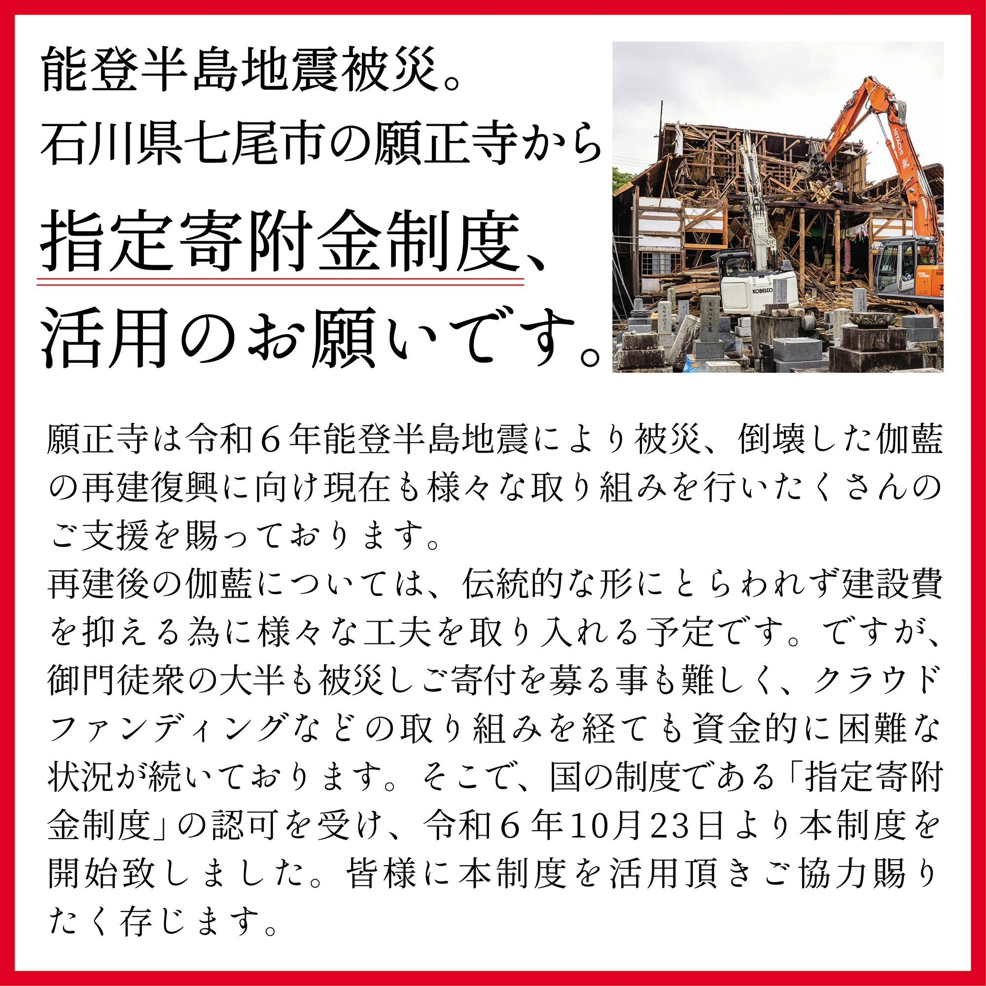 2024/11/05 13:04ご無沙汰しております。震災から11ヶ月、もうまもなく1年が経とうとしていますが未だ再建の目処がたたず皆様に明るい話題をお届け出来ず心苦しく思います。ですがこの度明るい話題として、国の政策である「指定寄附金制度」の認可がおりましたのでご報告させていただきます。願正寺にお納め頂いた寄附金を税金に充てることが出来、寄附者が税制上の優遇措置を受けれる制度です。我々被災地にある末寺にとってありがたい制度です。ご興味のある方は是非ご活用いただきたく切に願います。詳しくは当寺X(旧Twitter)や文化庁ホームページ等に記載がありますのでご確認ください。https://x.com/ganshojinanaoなお、実施期間は3年で募集金額に達し次第、本制度は終了となりますのでご了承ください。合掌願正寺第二十四世住職 もっと見る
