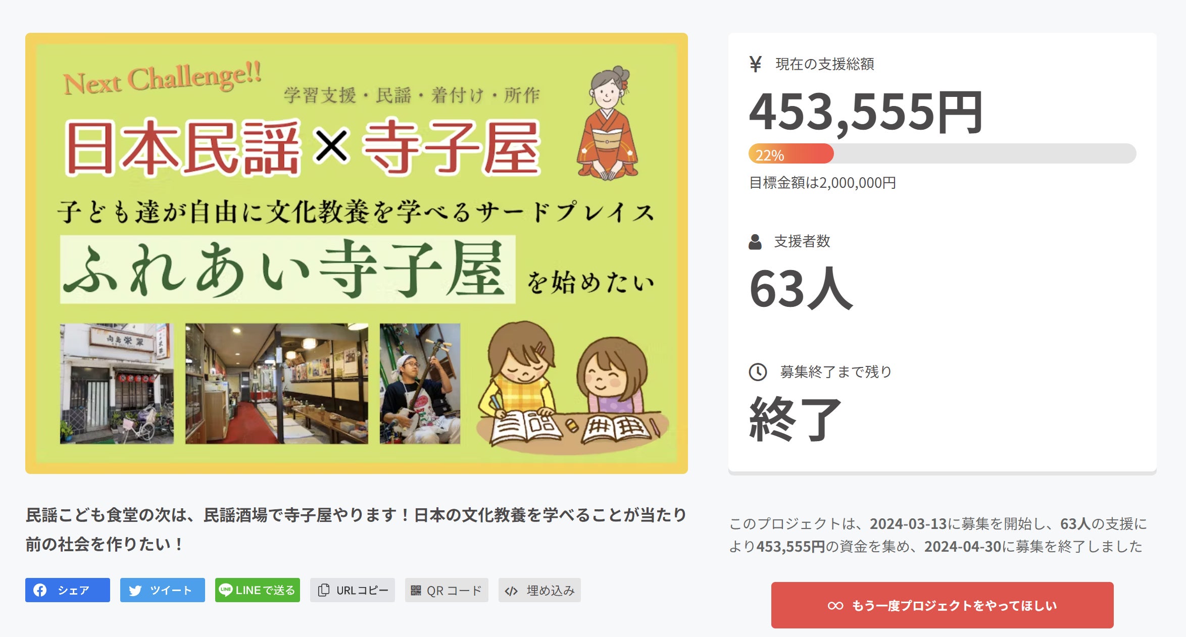 2024/05/01 07:00クラウドファンディング「子ども達が文化的教養を自由に学べるサードプレイスを作る!」の挑戦は、2024年4月30日(火)をもちまして、100%の SUCCESS は叶いませんでしたが、63名さまからのご支援を賜り453,555円のFUNDEDいただきまして、終了いたしました。前回の挑戦を超える支援総額と支援者数で、終えることが出来ました。たくさんのご支援や応援をいただきまして、本当にありがとうございます。4時間を超えるフィナーレのライブ配信もトラブルありつつも沢山の方に盛り上げていただきました。アーカイブをご覧いただけますので、ご視聴いただけましたら幸いです。※途中音声の乱れが含まれておりますがご容赦くださいここが一つのゴールでありスタートであるとの認識をもって、今後も有意義な活動に繋げて参ります。 もっと見る