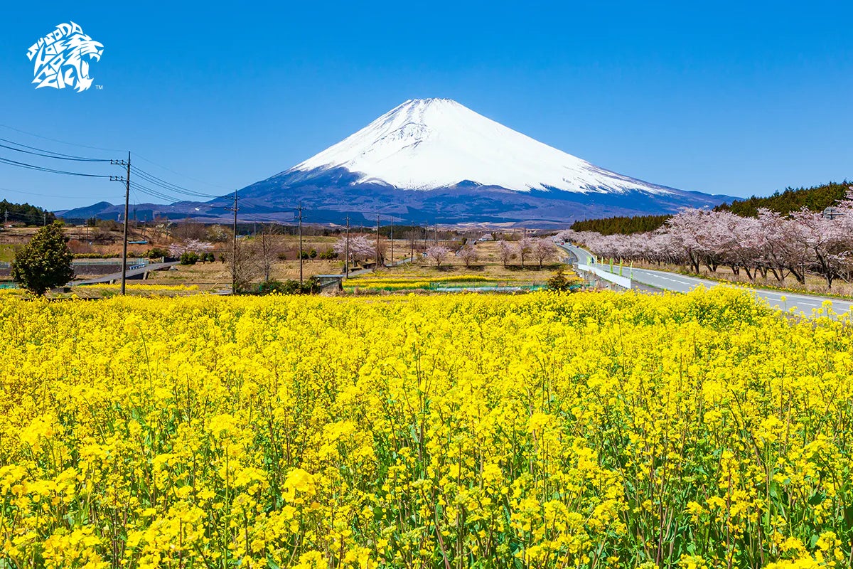 イベント会場の裾野市運動公園前のパノラマロードでは、春には美しい富士山と街路の桜、菜の花が咲き誇る風景がおたのしみただけます。