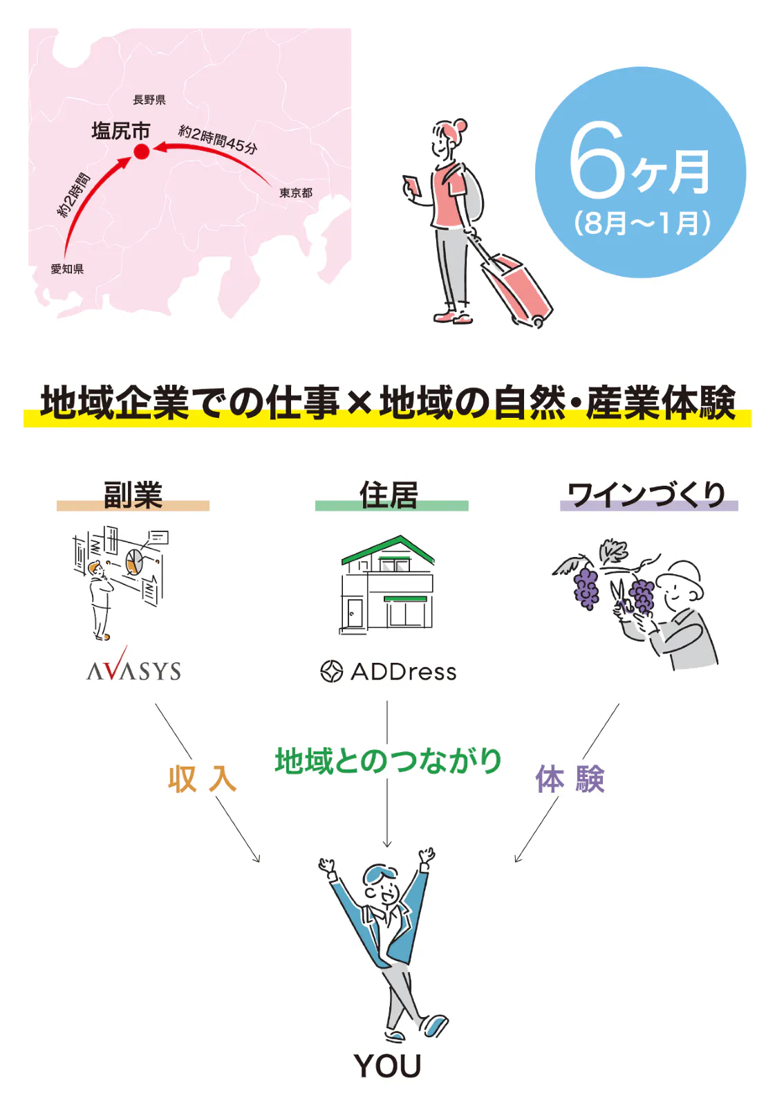 プロジェクトは2023年8月〜2024年1月の6か月にわたり、地域企業で働きながら、地域で二拠点生活、ワインづくりを体験できるという「半ワイン半X」の仮説を実現したものです。