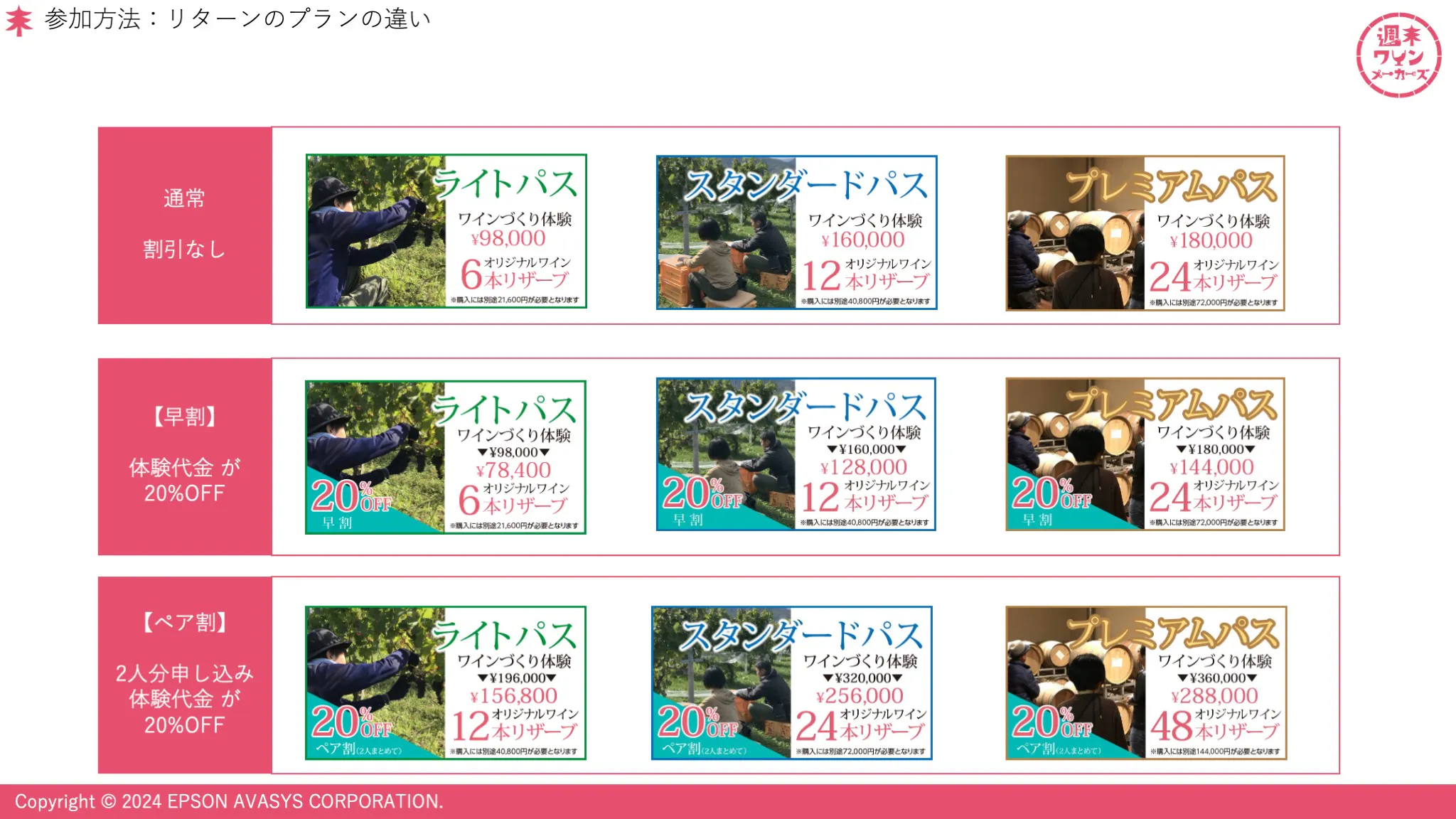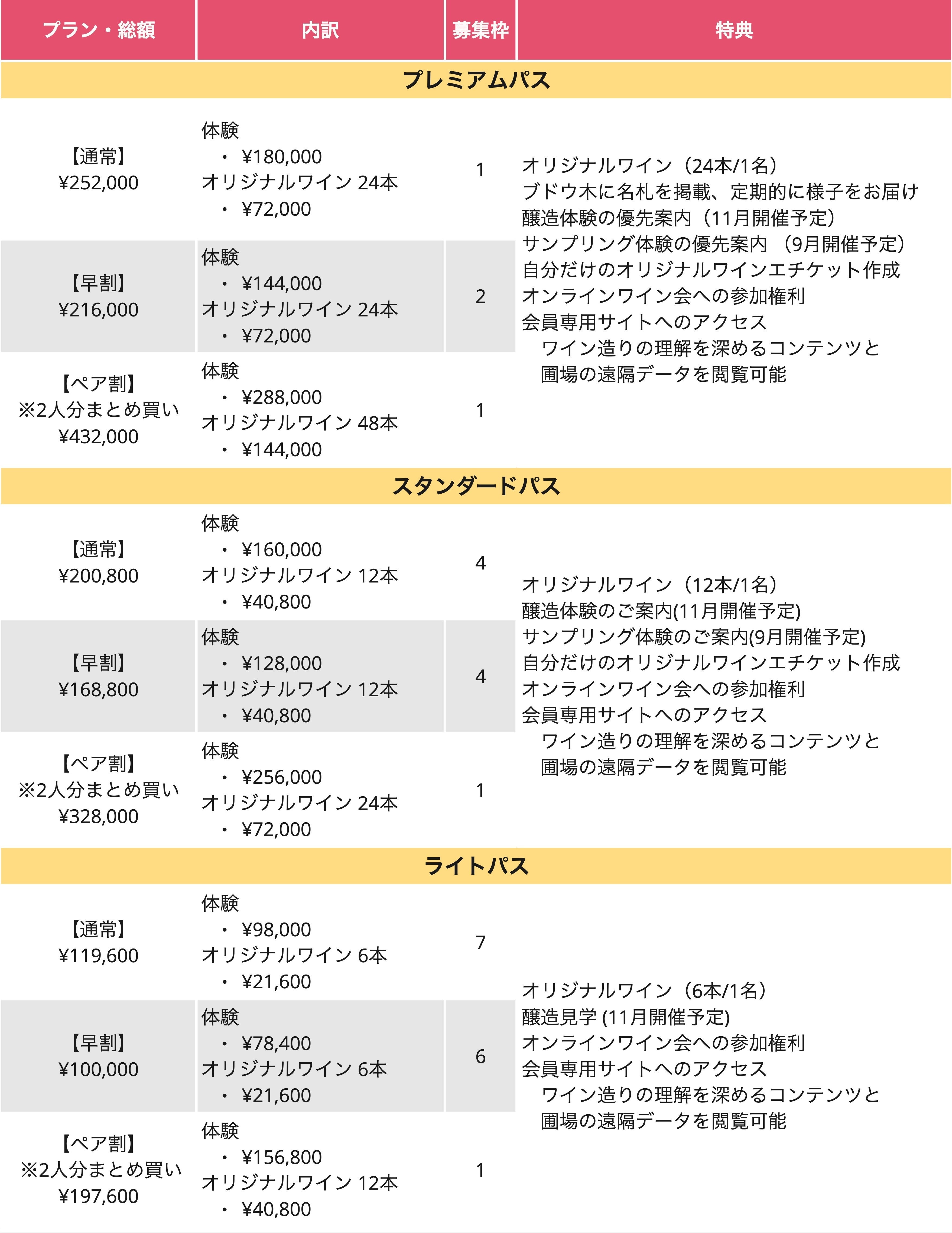 体験の内容とオリジナルワインの購入本数に応じた3種類のパスをご用意しています。