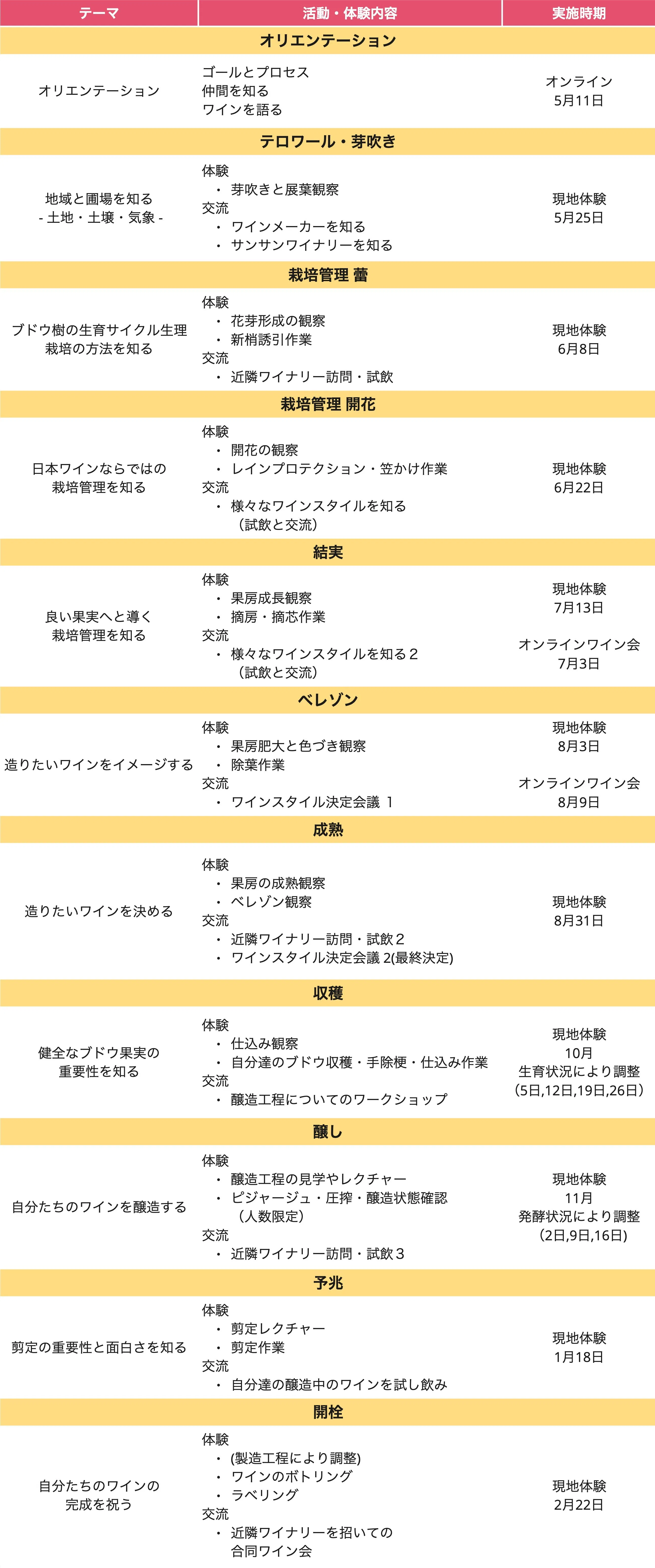 今年の5月から翌年の2月までの10か月、サンサンワイナリーで月に1回程度の週末に栽培・醸造体験を行い、最後に自分たちでつくりあげたワインで乾杯しよう。というプログラムです。