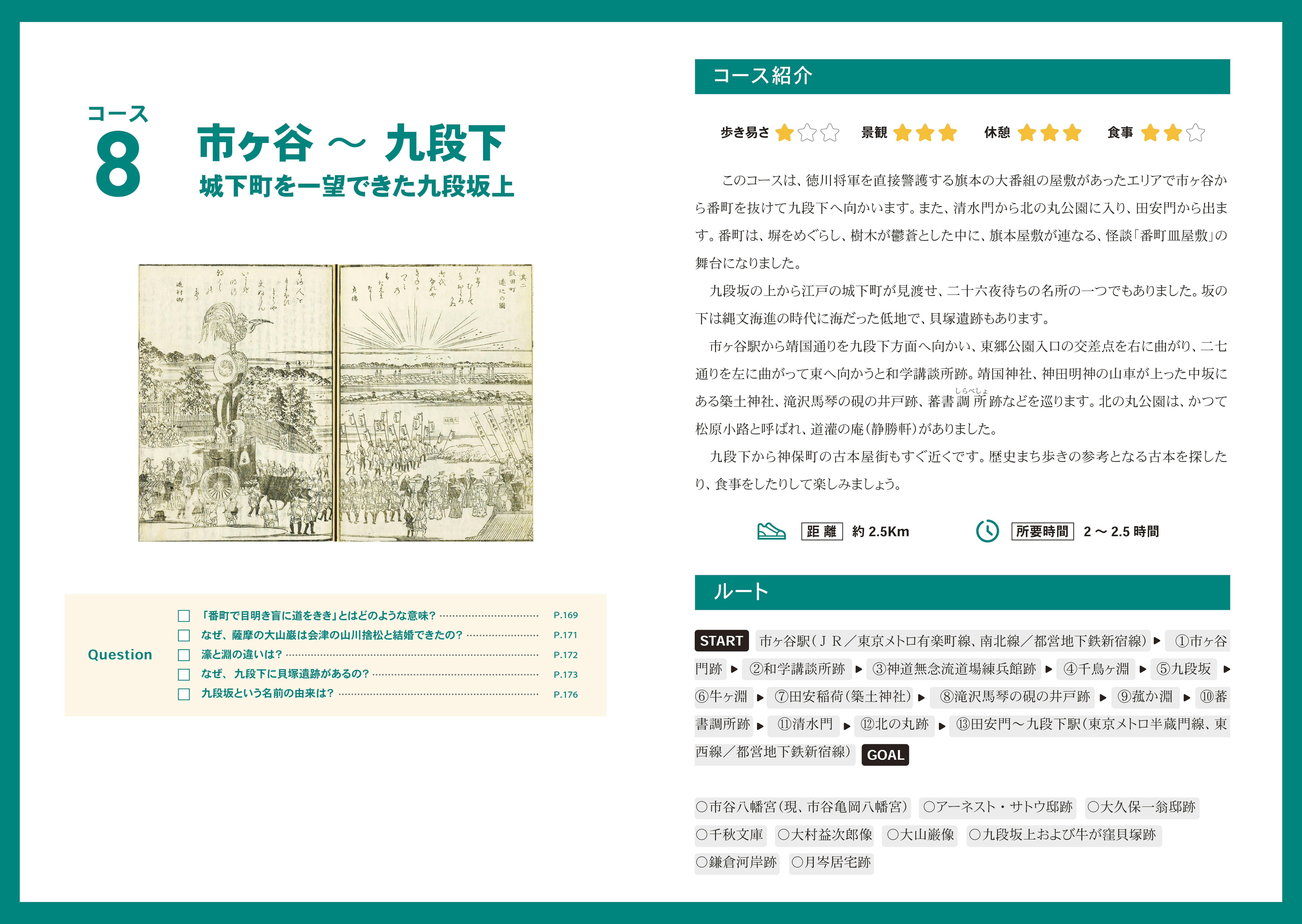 『訪江戸まち歩き 東京観光ガイドブックVol.Ⅰ』では、この「歴史の駅」をたどりながらまち歩きを楽しむことができるようにルートを設定しました。スタート地点をJRまたは地下鉄の駅で、2時間から2.5時間で回れます。ガイドブックの読者が自分でルートをアレンジできるように、ルート外の「歴史の駅」も紹介しています。
