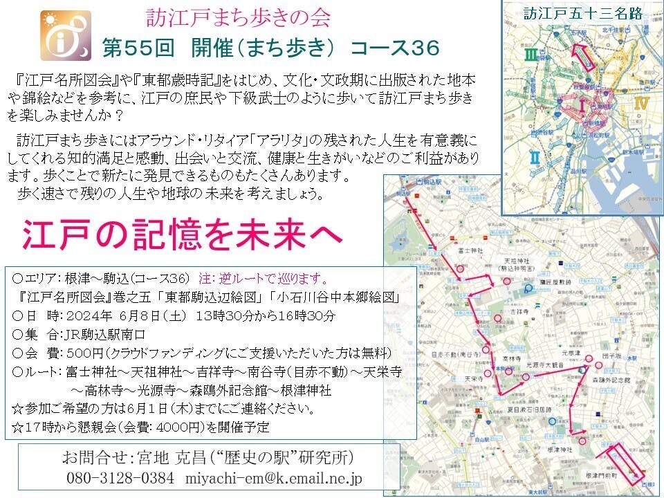 2024/05/14 07:325月18日の終了まで残り、5日となりました。訪江戸まち歩きの会では毎月第2土曜日にまち歩きを実施していますが、6月8日(土)は、『訪江戸まち歩き 東京観光ガイドブック Vol.Ⅰ』の出版を記念して「まち歩き&懇親会」として開催します。ご支援いただいた方には参加費(500円)を無料とさせていただきます。ご都合よろしければ、ぜひ、懇親会(会費4000円)にもご参加ください。メールで miyachi-em@k.email.ne.jp まで申し込みいただいた方には、今回のコース(コース36) の資料を事前にPDFでお送りします。宮地克昌 もっと見る