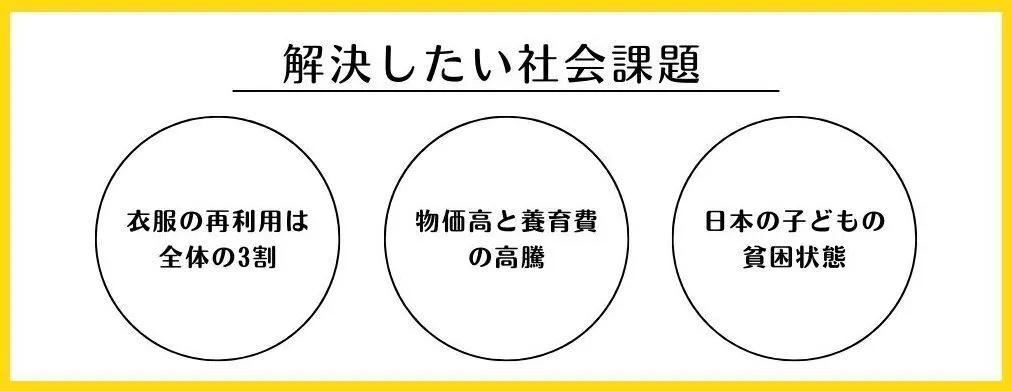 上記の社会課題より、子育て世帯は非常に生活が大変で、少しでも切り詰めたいと考えます。それが少子化の要因の1つになっています。無駄に捨てられる子供服を「今必要としている子供達に届ける」ことが必要とであると考えました。