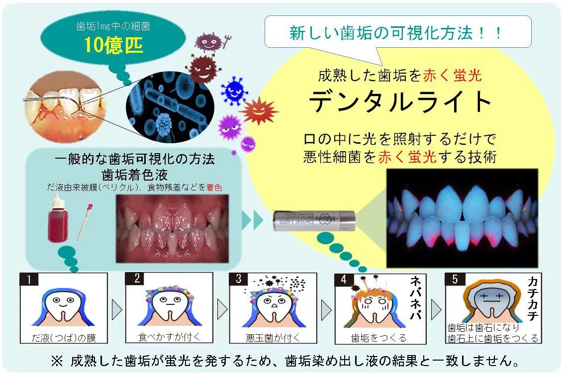 着色液不要。成熟したプラークを蛍光で可視化